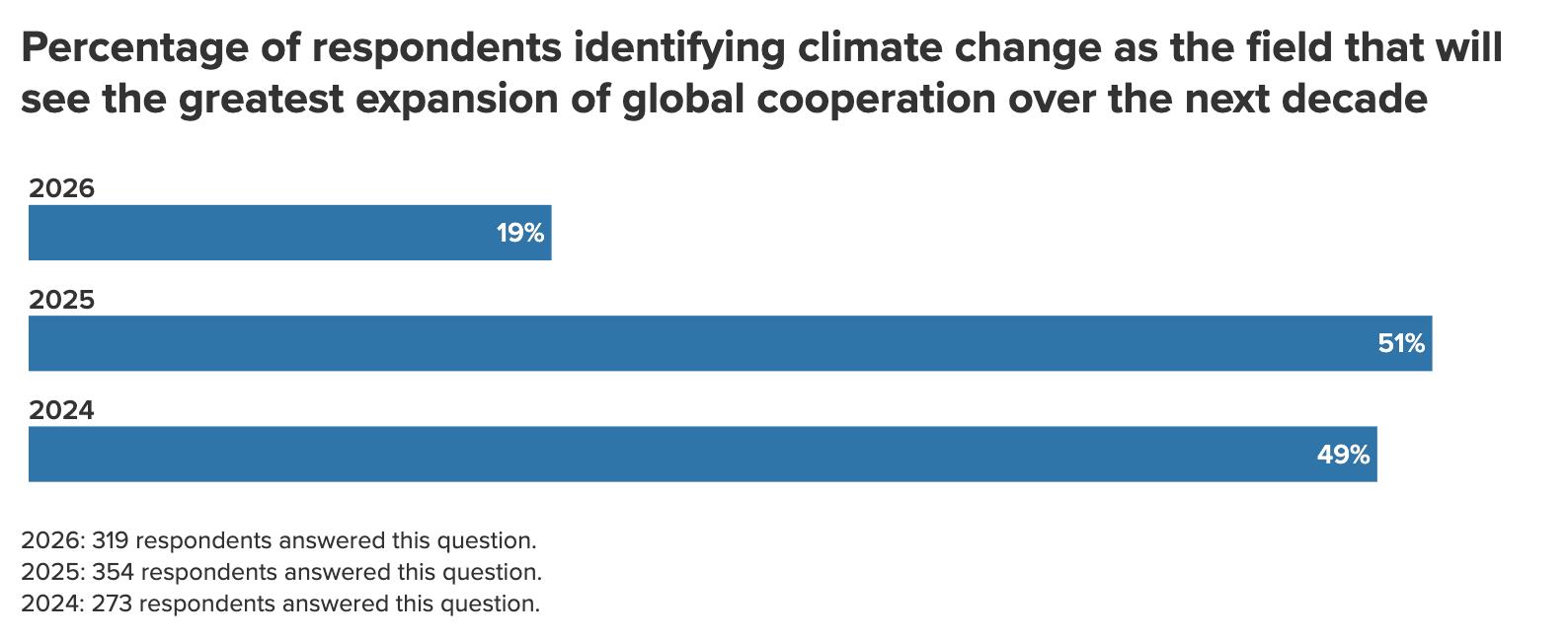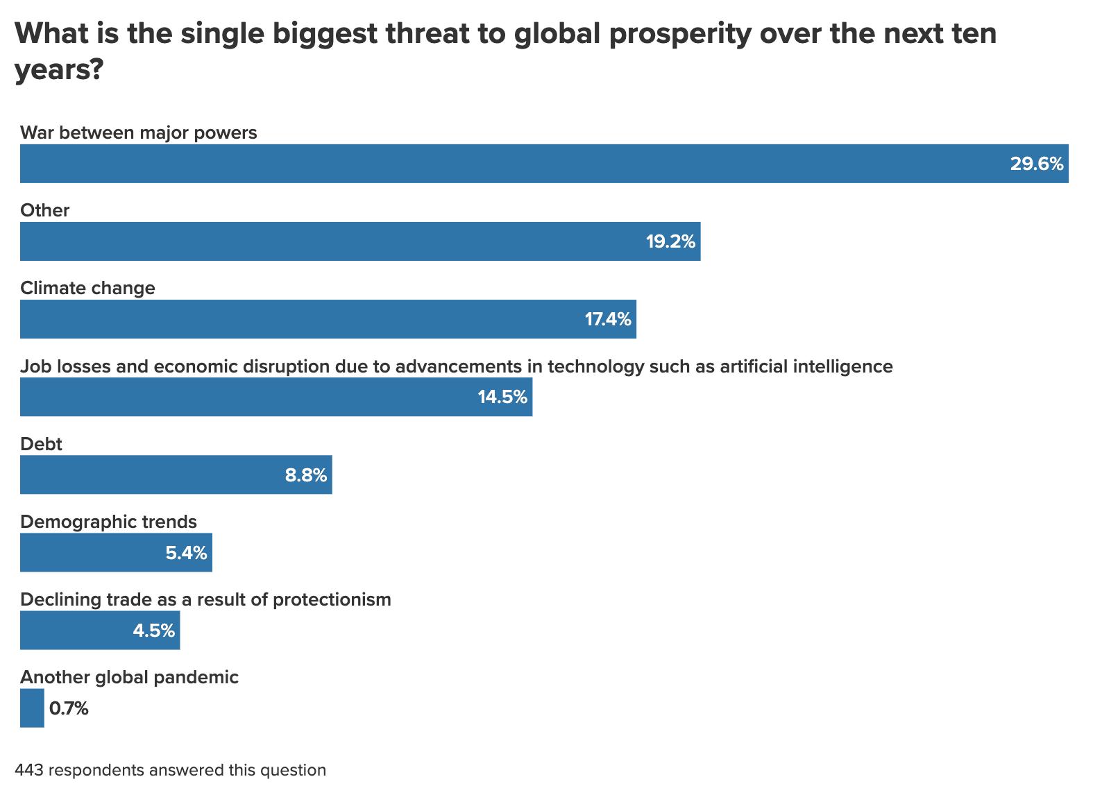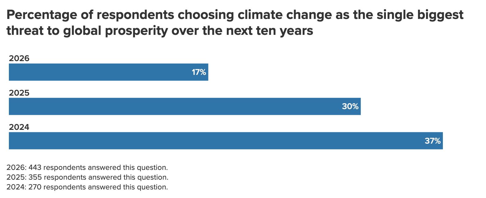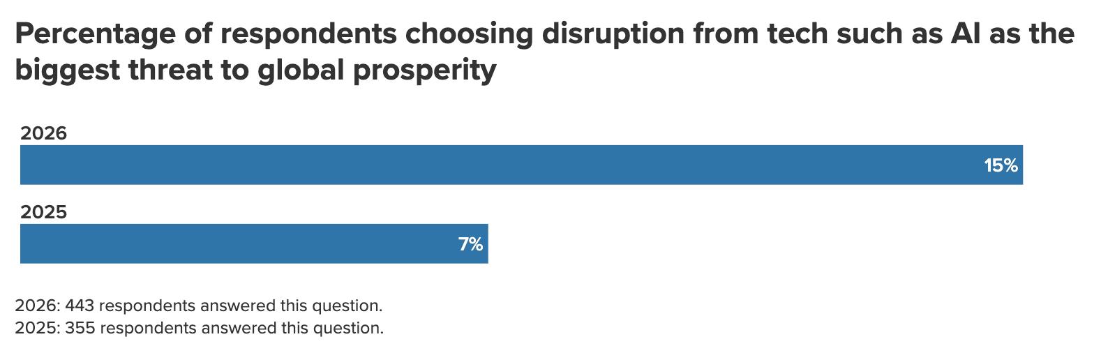 Similarly, while worries about AI’s economic impact remain low among respondents, they are growing. Fourteen percent of respondents now see job losses and economic disruption due to advancements in technology such as AI as the single biggest threat to global prosperity in the coming decade. That’s more than double the previous year’s figure of 6 percent. 24