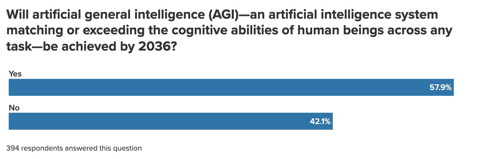Survey respondents expect artificial intelligence (AI) to progress rapidly over the coming decade. A clear majority (58 percent) believe that, by 2036, the world will have gone beyond today’s predictive and generative AI systems to achieve artificial general intelligence (AGI), which is defined in the survey as “an artificial intelligence system matching or exceeding the cognitive abilities of human beings across any task”—one of the most ambitious goals AI companies are currently pursuing.
