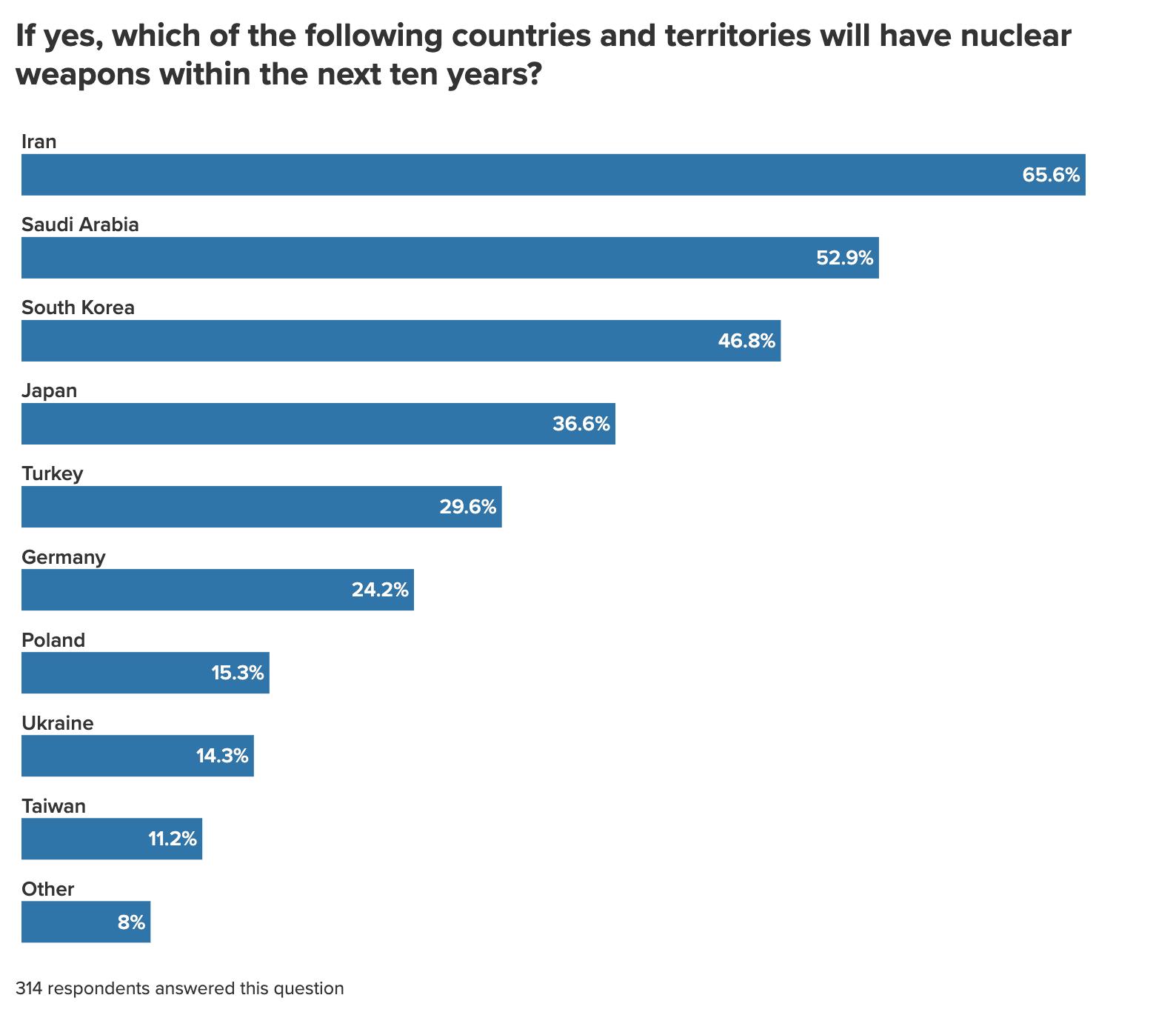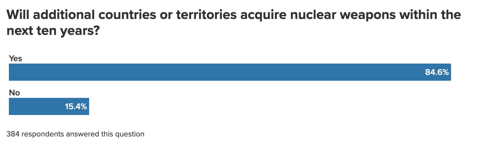 Respondents also indicated that several NATO member states without nuclear weapons might acquire them by 2036. Among the 85 percent of survey respondents who think that at least one new country or territory will obtain nuclear weapons within the next decade, about 30 percent expect Turkey to do so, 24 percent Germany, and 15 percent for Poland. This may reflect an assessment that a possible US withdrawal of its nuclear umbrella from Europe or from its leading role in the Alliance could prompt these NATO member states to go nuclear.