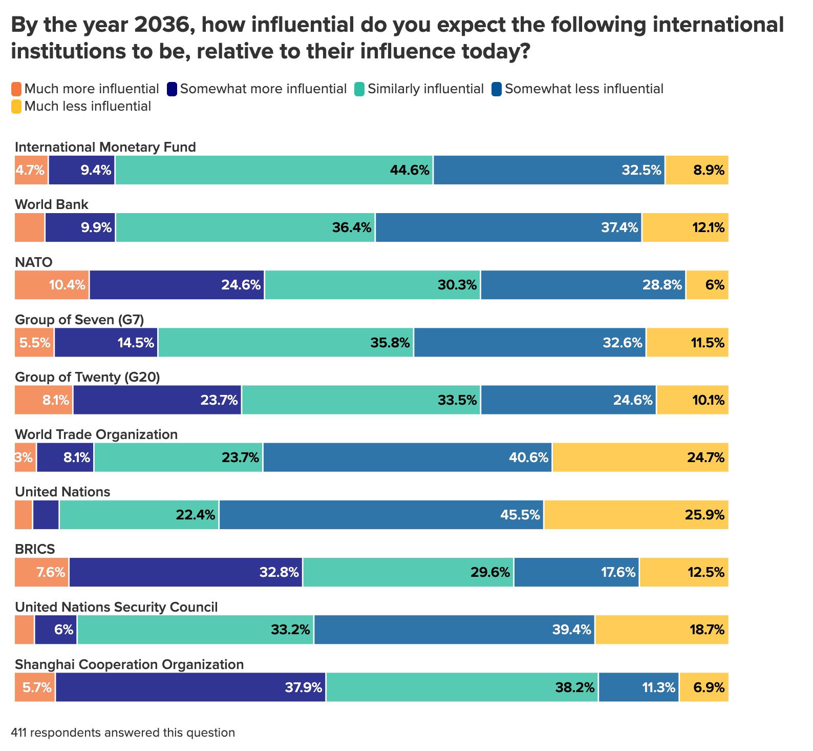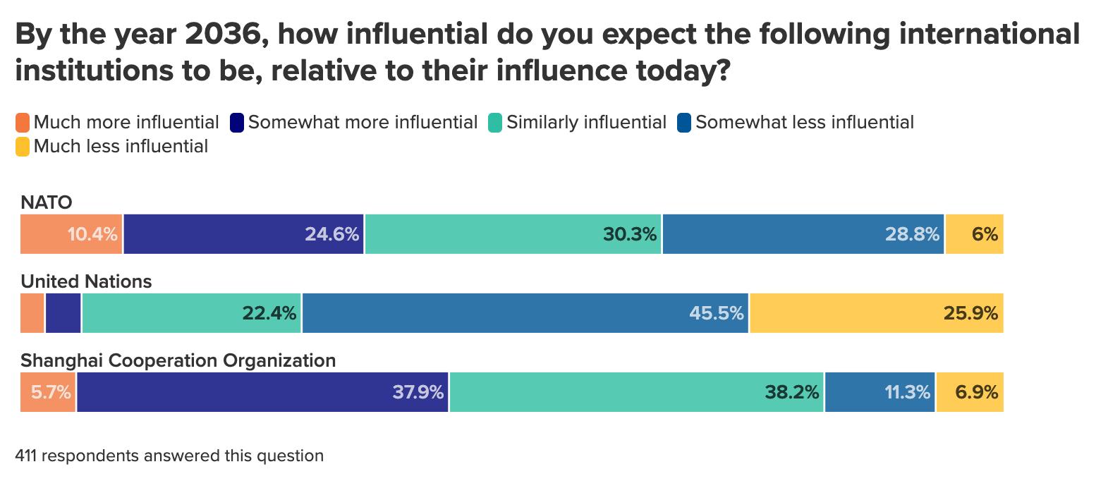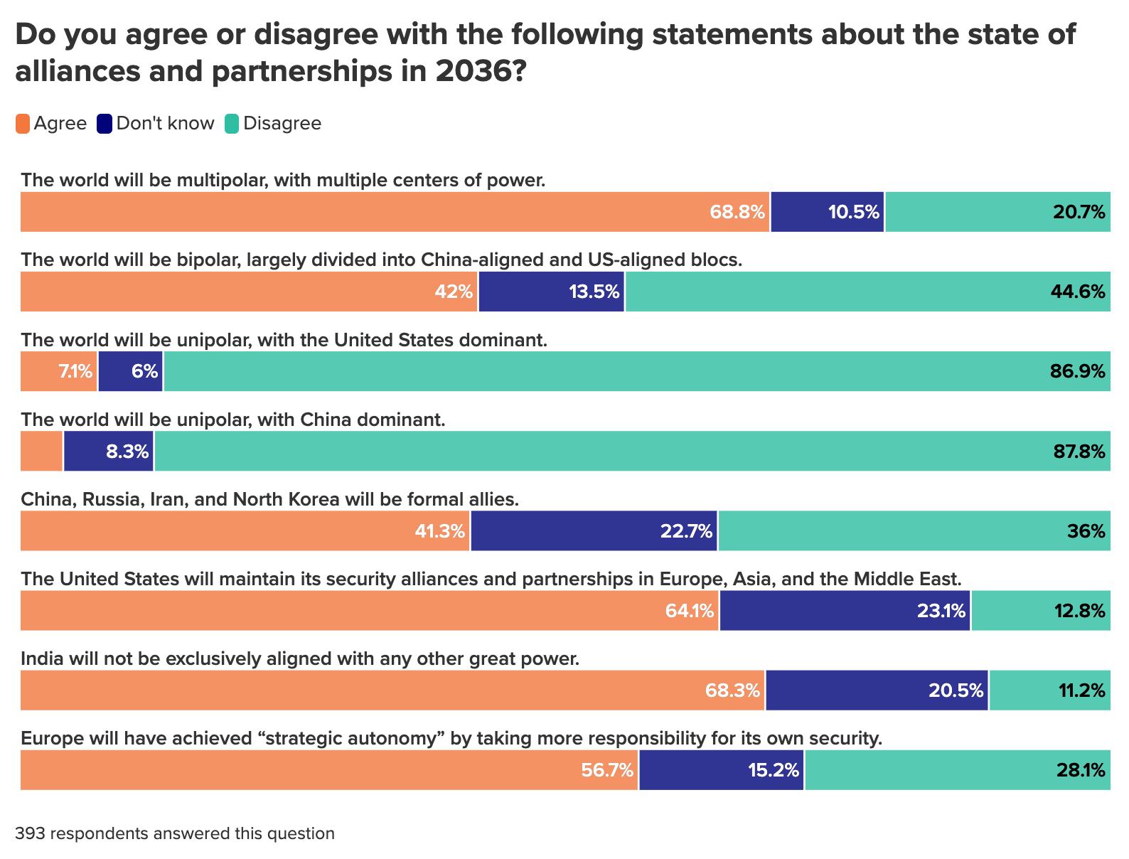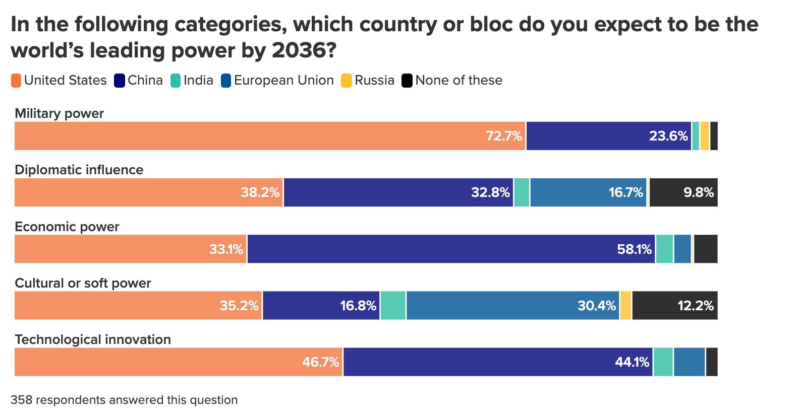 Most survey respondents do not believe that the United States will be the world’s dominant power in 2036, with only seven percent saying that it will be. And while an even smaller percentage (four percent) believe that China will be the dominant global power, the great majority of polled experts (around nine in ten) believe that these powers will compete for supremacy either in a bipolar world largely divided into China-aligned and US-aligned blocs or in a multipolar one with multiple centers of power.