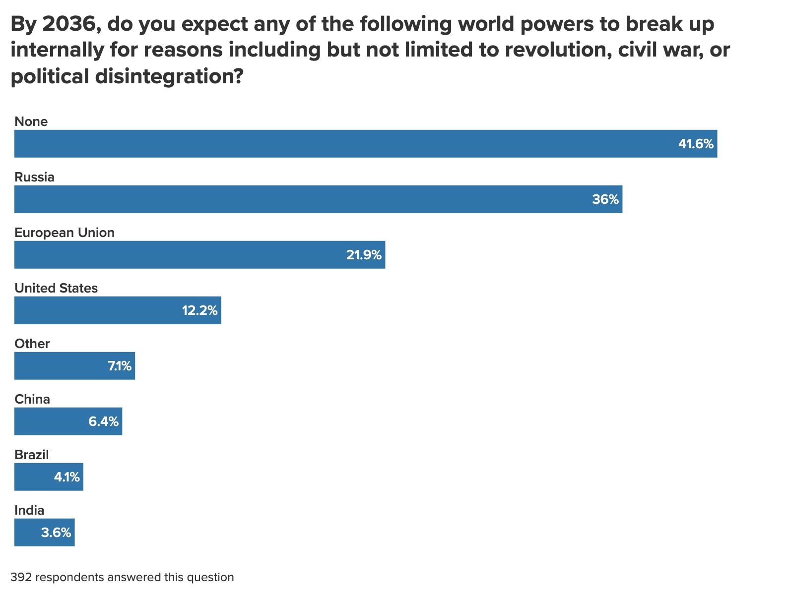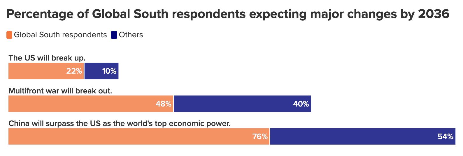 Meanwhile, respondents believe that Russia is destined to be a lesser power. By 2036, respondents expect minimal Russian clout across all five metrics of power tested in the survey. Just 2 percent of those surveyed believe that Russia will be the world’s leading country in cultural or soft power by 2036 and 1 percent say the same regarding military power. In all other areas, the figure rounds down to 0 percent. Respondents also cited Russia more than any other world power as a candidate to break up internally as a result of developments such as revolution, civil war, or political disintegration, with 36 percent expecting such an outcome relative to 30 percent in the previous year’s survey. 20 (The latest figure is only slightly below this question’s high of 40 percent of respondents forecasting Russia’s breakup a few years ago, shortly before Yevgeny Prigozhin staged a rebellion against the Kremlin.)21