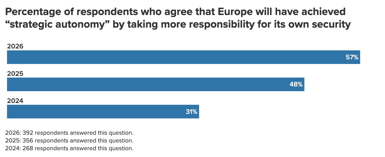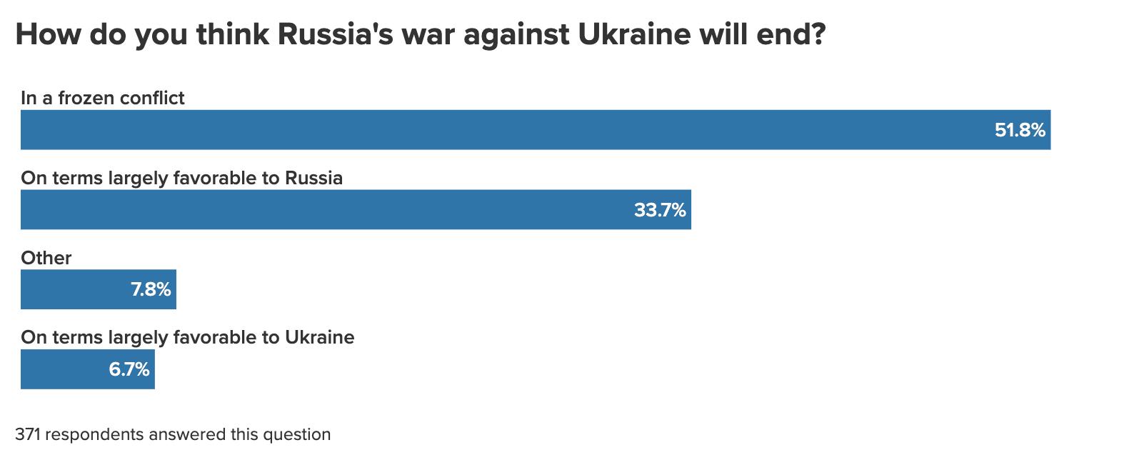 A high-profile, US-led push for a final negotiated settlement to the war in Ukraine dominated headlines while this year’s survey was in the field. Despite that, respondents shifted in the direction of anticipating a frozen conflict. Just 34 percent of respondents think that the war will end on terms largely favorable to Russia, down substantially from the nearly half of respondents (47 percent) who answered that way in our previous year’s survey. Conversely, slightly more than half of respondents (52 percent) now think the war ultimately will turn into a frozen conflict, up from 43 percent a year ago.