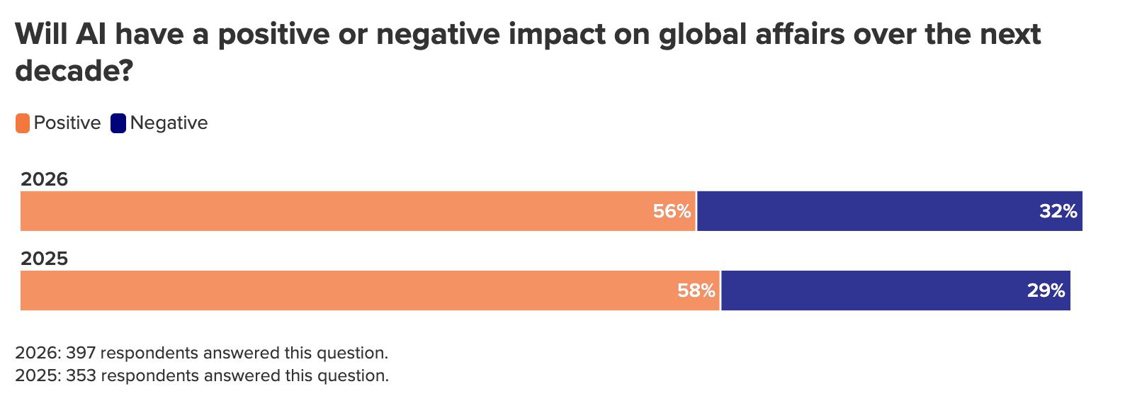 Fifty-six percent expect that AI will have a positive effect on global affairs over the next decade, relative to 32 percent who do not—overall a substantially more optimistic outlook than, for example, the general public in the United States has. 22 Although there is a clear gap between positive and negative expectations, that distance is closing amid increasing concerns about the technology. In the previous year’s survey, the figures were 58 percent and 29 percent, respectively, meaning that the gap between positive and negative assessments of AI’s impact has declined from 29 percentage points to 24 percentage points. 23