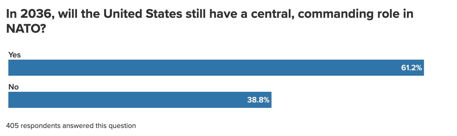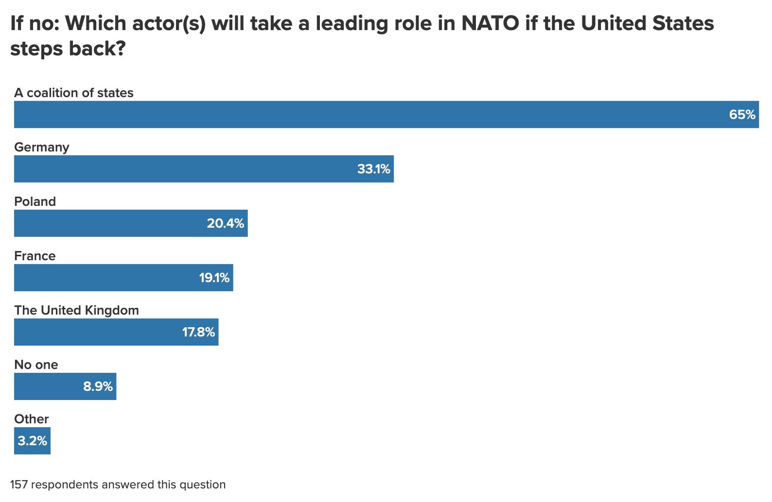 This finding likely relates to the part that the United States is expected to play in the Alliance going forward. A significant minority of respondents—39 percent—don’t envision the United States, by the year 2036, still having the central, commanding role in NATO that it has had since the Alliance’s founding, though the majority (61 percent) believe the United States will remain in this position. Among the group that envisions the United States no longer retaining its dominant role in the Alliance, 65 percent expect a coalition of states to take a leading role in NATO if Washington steps back, with smaller but still significant percentages citing Germany (33 percent), Poland (20 percent), France (19 percent), and the United Kingdom (18 percent) as potential Alliance leaders. (Respondents could choose more than one answer.)