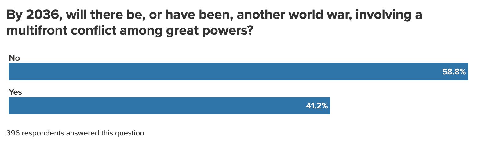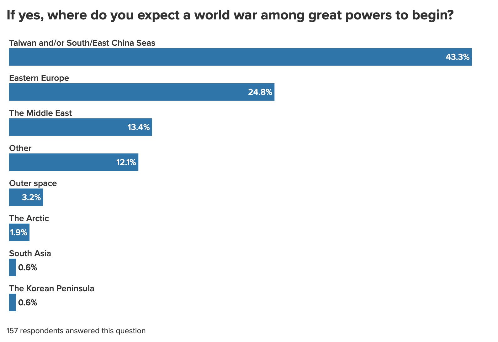While Taiwan was most commonly cited as the flashpoint for a potential global multifront war in the coming decade, only one respondent cited the Korean peninsula, which suggests respondents are underestimating the potential for a larger war to start with North Korean aggression there. As we explored in a report based on a tabletop exercise, either a conflict in the Taiwan Strait or on the Korean Peninsula could escalate into a broader war, including nuclear escalation.9