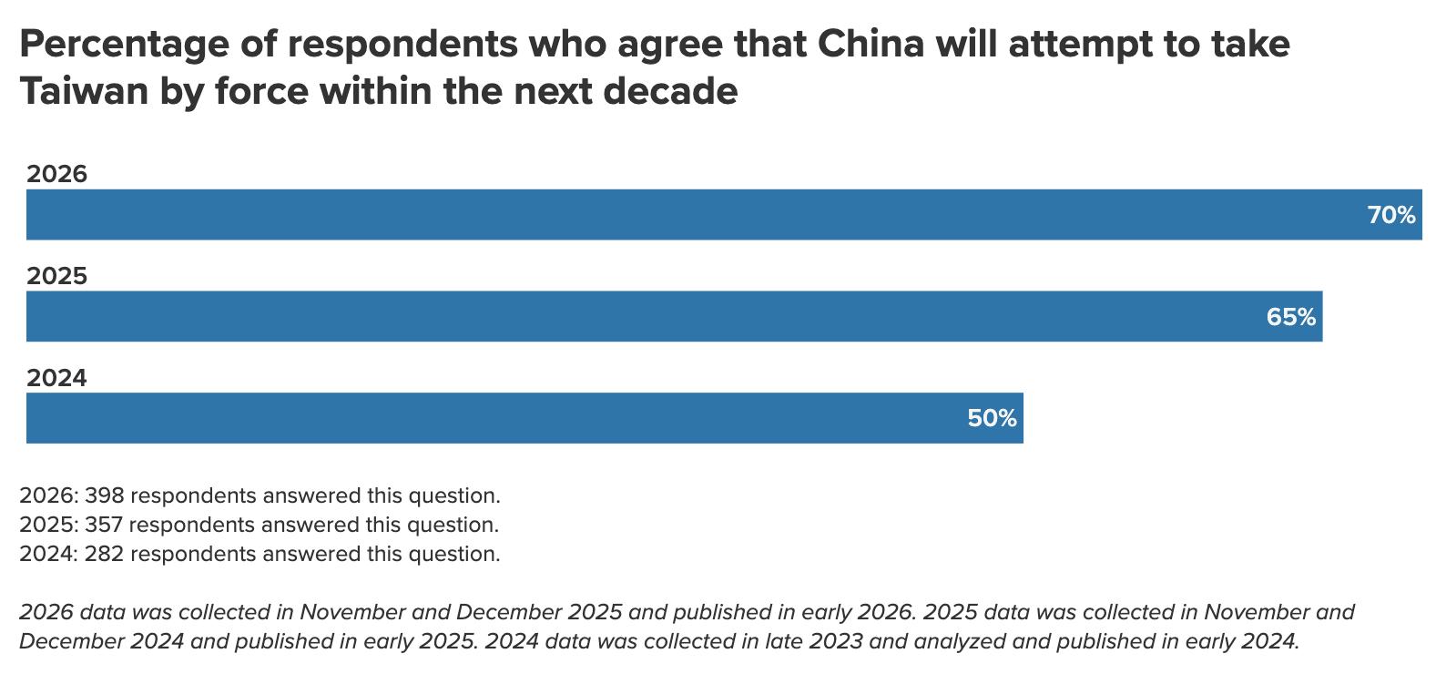 More than two-thirds of respondents (70 percent) believe that China will try to forcibly take Taiwan in the next decade—up from 65 percent in our previous year’s survey and 50 percent two years ago, signaling an increasing likelihood of this scenario materializing.2 The intensity of this concern seems to be growing as well: Twenty-one percent of respondents “strongly agree” that China will attempt