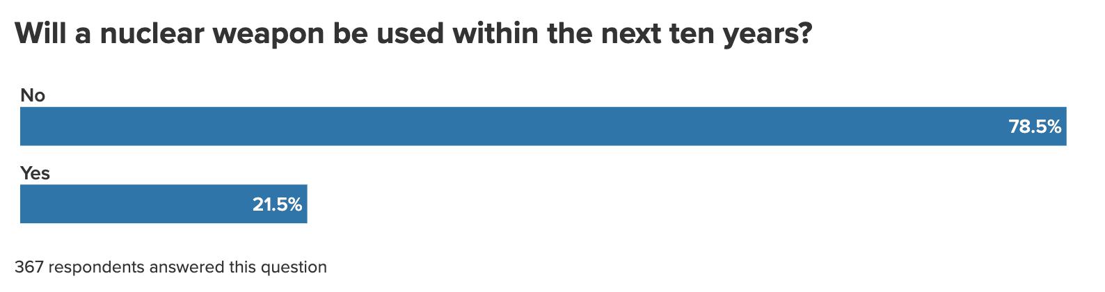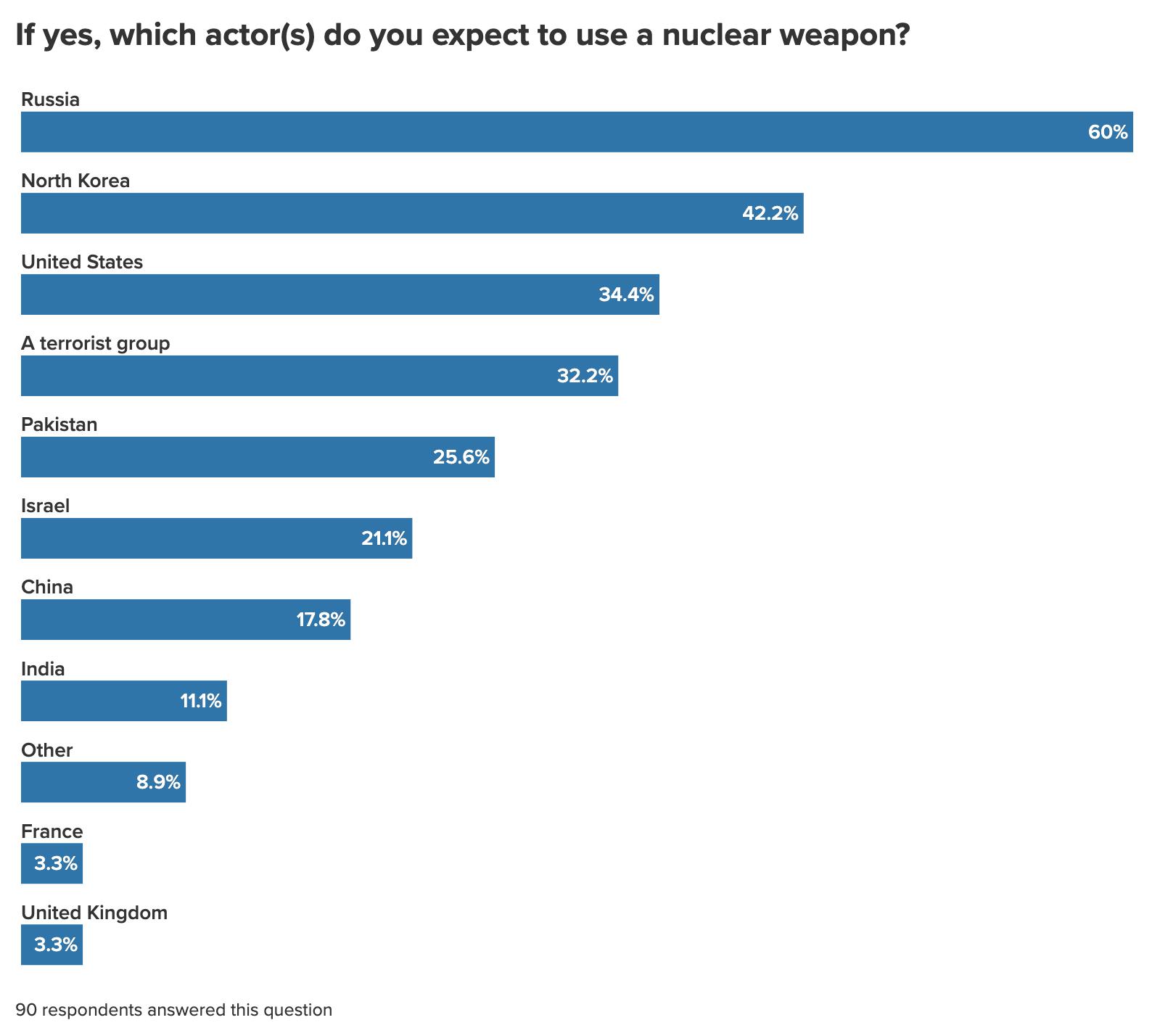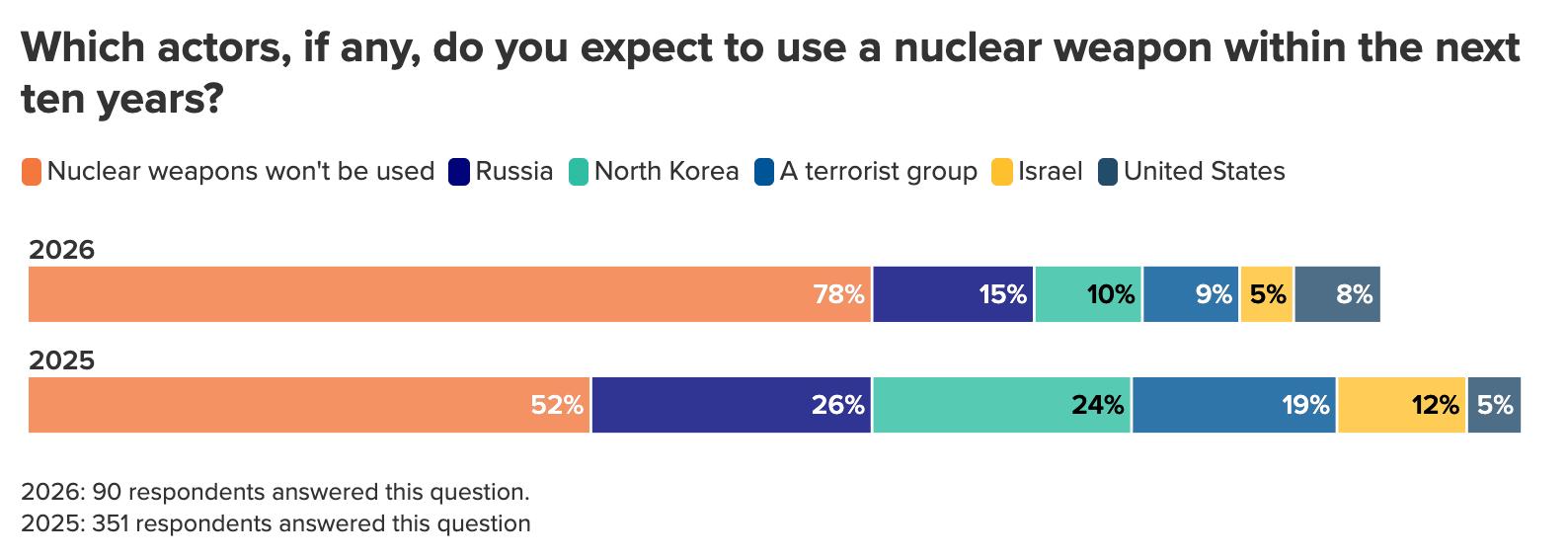Russian weakness, however, doesn’t necessarily reduce the danger it poses in Ukraine and beyond; in fact, it could increase the threat. Among the minority of respondents (22 percent) who expect a state or terrorist group to use nuclear weapons in the coming decade, 60 percent believe that Russia will do so, making it the most-cited actor.