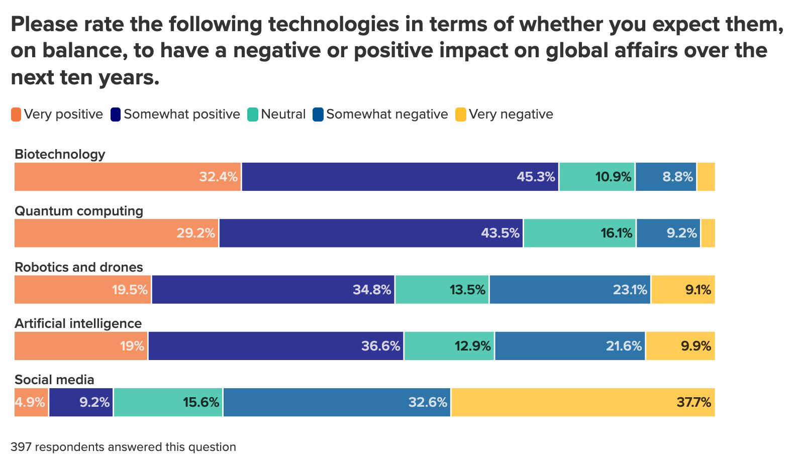 When it comes to social media, our survey respondents have expressed consistently negative views about the technology’s impact on the world—perhaps because social media is now a mature technology with clear downsides, in contrast with the positive expectations people had for the technology fifteen or twenty years ago. Views about AI could follow a similar course if its downside impacts ultimately outweigh its positive ones.