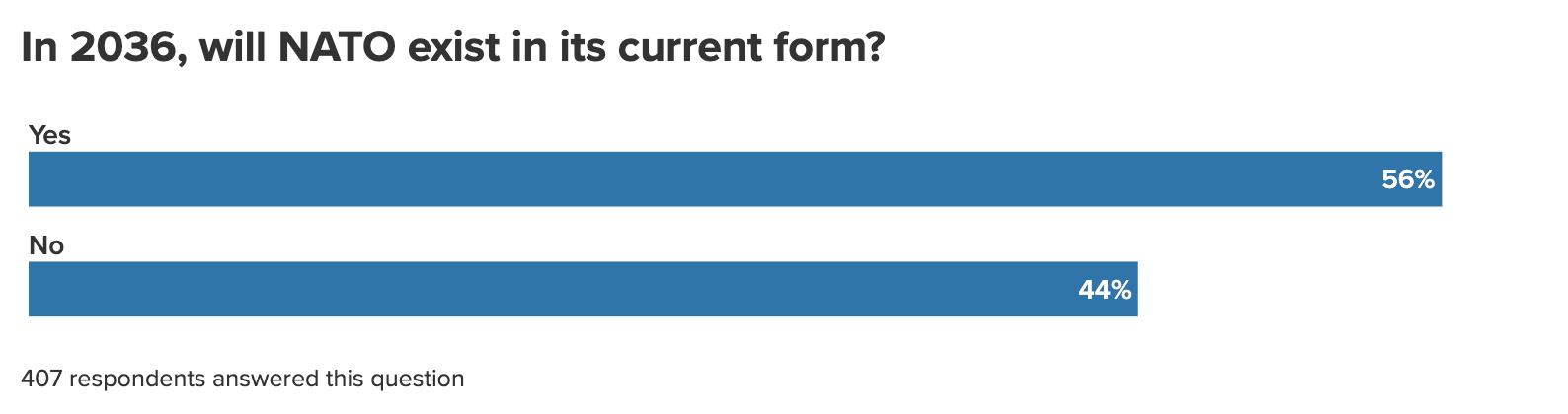 Amid major ups and downs for NATO in the first year of the second Trump administration—from commitments to ramp up defense spending at The Hague summit in 2025 to the standoff between Denmark and the United States over the status of Greenland—survey respondents are split evenly on whether the Alliance will grow more influential (35 percent) or less (35 percent) in ten years’ time.18 Behind these equivocal answers about NATO’s future power, however, is a clear and substantial measure of doubt regarding the future of the Alliance itself: Nearly half of respondents (44 percent) believe that NATO will no longer exist in its current form in 2036. Among this group expecting fundamental change, half (51 percent) anticipate that a reconfigured NATO will be less influential than the current alliance.