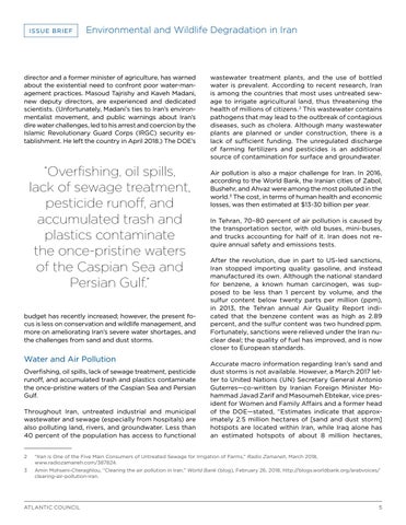 wastewater treatment plants, and the use of bottled water is prevalent. According to recent research, Iran is among the countries that most uses untreated sewage to irrigate agricultural land, thus threatening the health of millions of citizens. 2 This wastewater contains pathogens that may lead to the outbreak of contagious diseases, such as cholera. Although many wastewater plants are planned or under construction, there is a lack of sufficient funding. The unregulated discharge of farming fertilizers and pesticides is an additional source of contamination for surface and groundwater. Air pollution is also a major challenge for Iran. In 2016, according to the World Bank, the Iranian cities of Zabol, Bushehr, and Ahvaz were among the most polluted in the world.3 The cost, in terms of human health and economic losses, was then estimated at $13-30 billion per year. In Tehran, 70–80 percent of air pollution is caused by the transportation sector, with old buses, mini-buses, and trucks accounting for half of it. Iran does not require annual safety and emissions tests. After the revolution, due in part to US-led sanctions, Iran stopped importing quality gasoline, and instead manufactured its own. Although the national standard for benzene, a known human carcinogen, was supposed to be less than 1 percent by volume, and the sulfur content below twenty parts per million (ppm), in 2013, the Tehran annual Air Quality Report indicated that the benzene content was as high as 2.89 percent, and the sulfur content was two hundred ppm. Fortunately, sanctions were relieved under the Iran nuclear deal; the quality of fuel has improved, and is now closer to European standards. Accurate macro information regarding Iran’s sand and dust storms is not available. However, a March 2017 letter to United Nations (UN) Secretary General Antonio Guterres—co-written by Iranian Foreign Minister Mohammad Javad Zarif and Masoumeh Ebtekar, vice president for Women and Family Affairs and a former head of the DOE—stated, “Estimates indicate that approximately 2.5 million hectares of [sand and dust storm] hotspots are located within Iran, while Iraq alone has an estimated hotspots of about 8 million hectares,