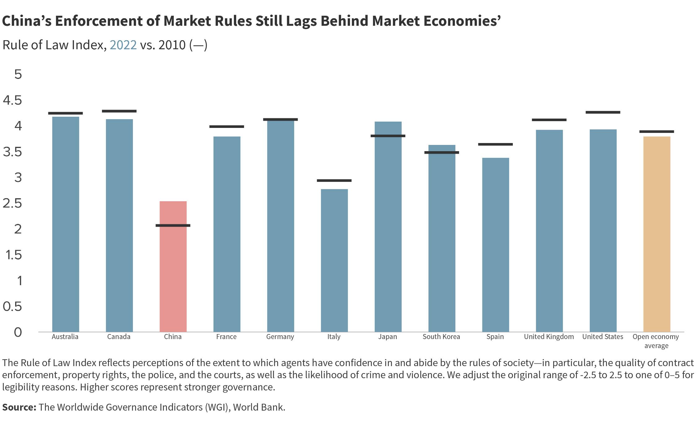 • China has made some reform progress, with trade openness a standout improvement. China’s trade openness is within the range of market norms, and its goods trade practices are likely to remain a point of progress. Despite still being well behind OECD norms, China has also made progress over the past decade in