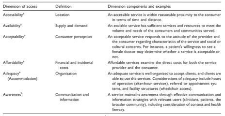 The model used here, adapted from Penchansky and Thomas by Saurman et al , has been a useful tool to explore access to healthcare in all three communities. We found it to be complete and we did not require additional factors to describe the barriers to health service