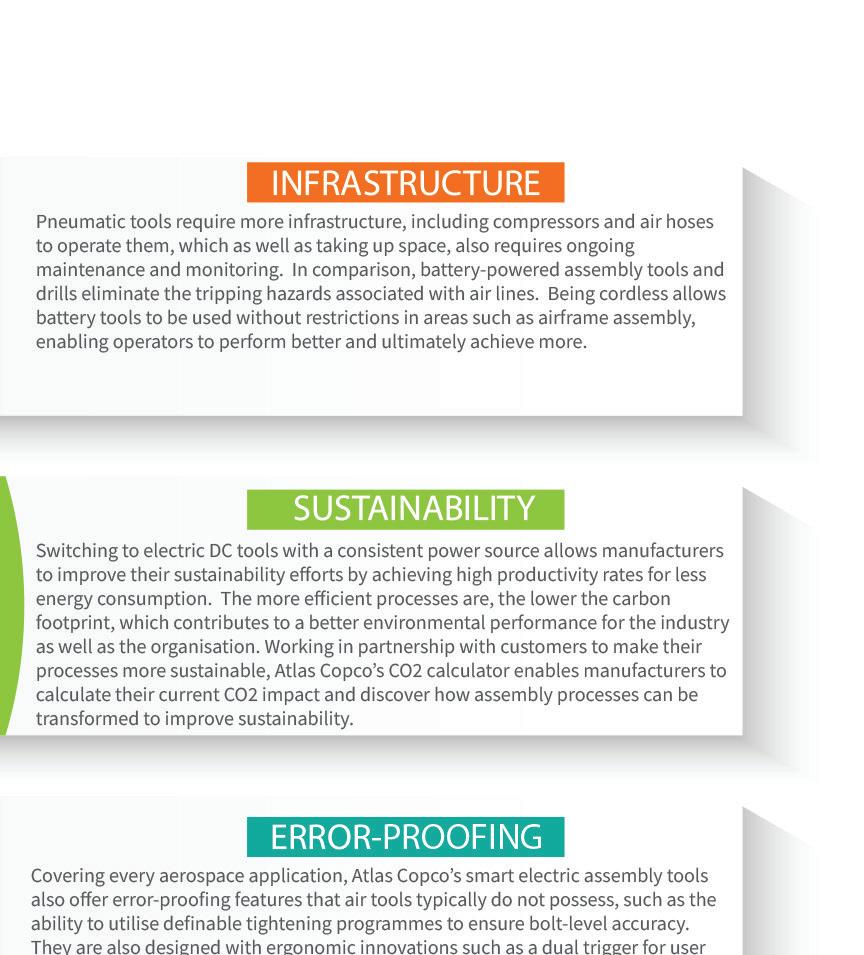 Within the production environment itself, aerospace manufacturers are under pressure to reduce carbon emissions, whilst improving quality. The transition to electrification, from a pneumatic-driven manufacturing process, that is reliant on compressed air tools, is very much underway. Many of Atlas Copcoʼs largest customers are switching to DC-based, cordless tooling solutions. Not only does this improve the safety of the factory floor due to the removal of air lines, but also reduces the carbon footprint from the improved energy efficiency of the latest generation tools.