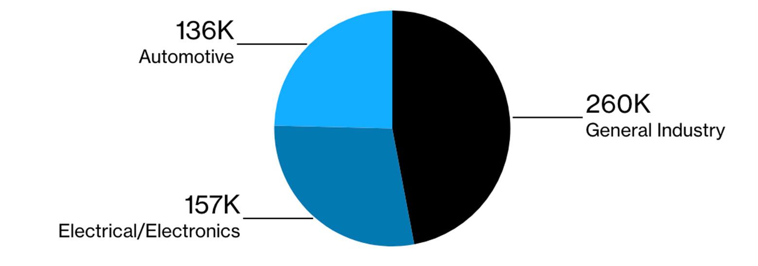 For context, the global automotive industry accounted for a quarter of the world’s industrial robot installations in 2022, while the electronics manufacturing sector made up about 28%, according to the International Federation of Robotics. Aerospace is grouped together with rail, marine and space vehicles, in the category of ‘general industry’, as highlighted in the chart below.