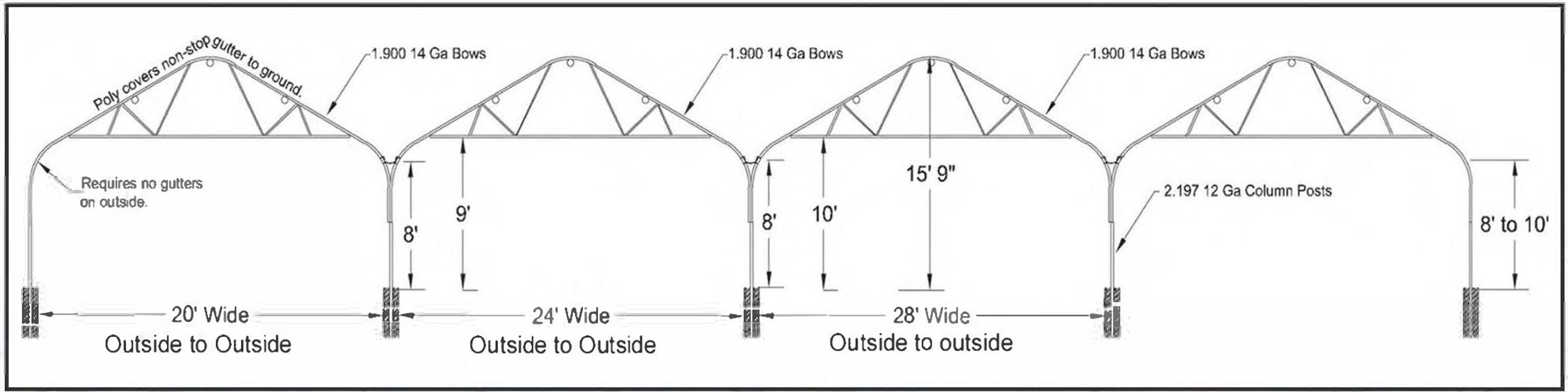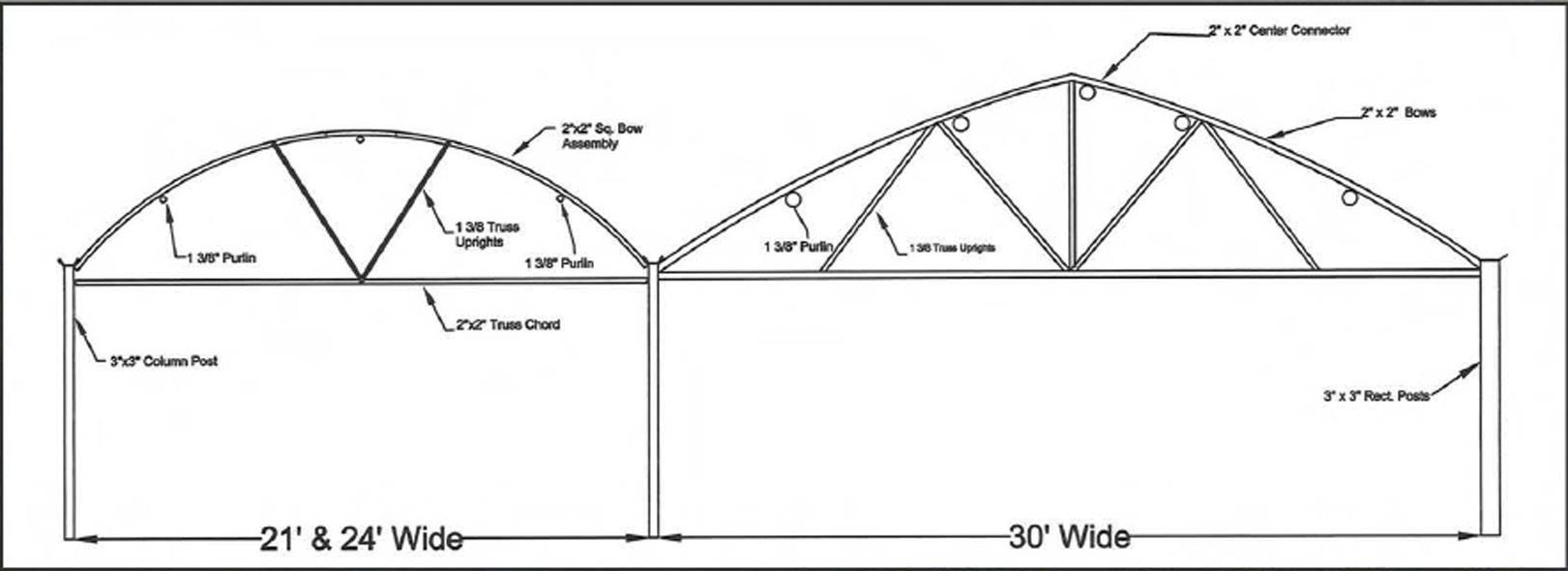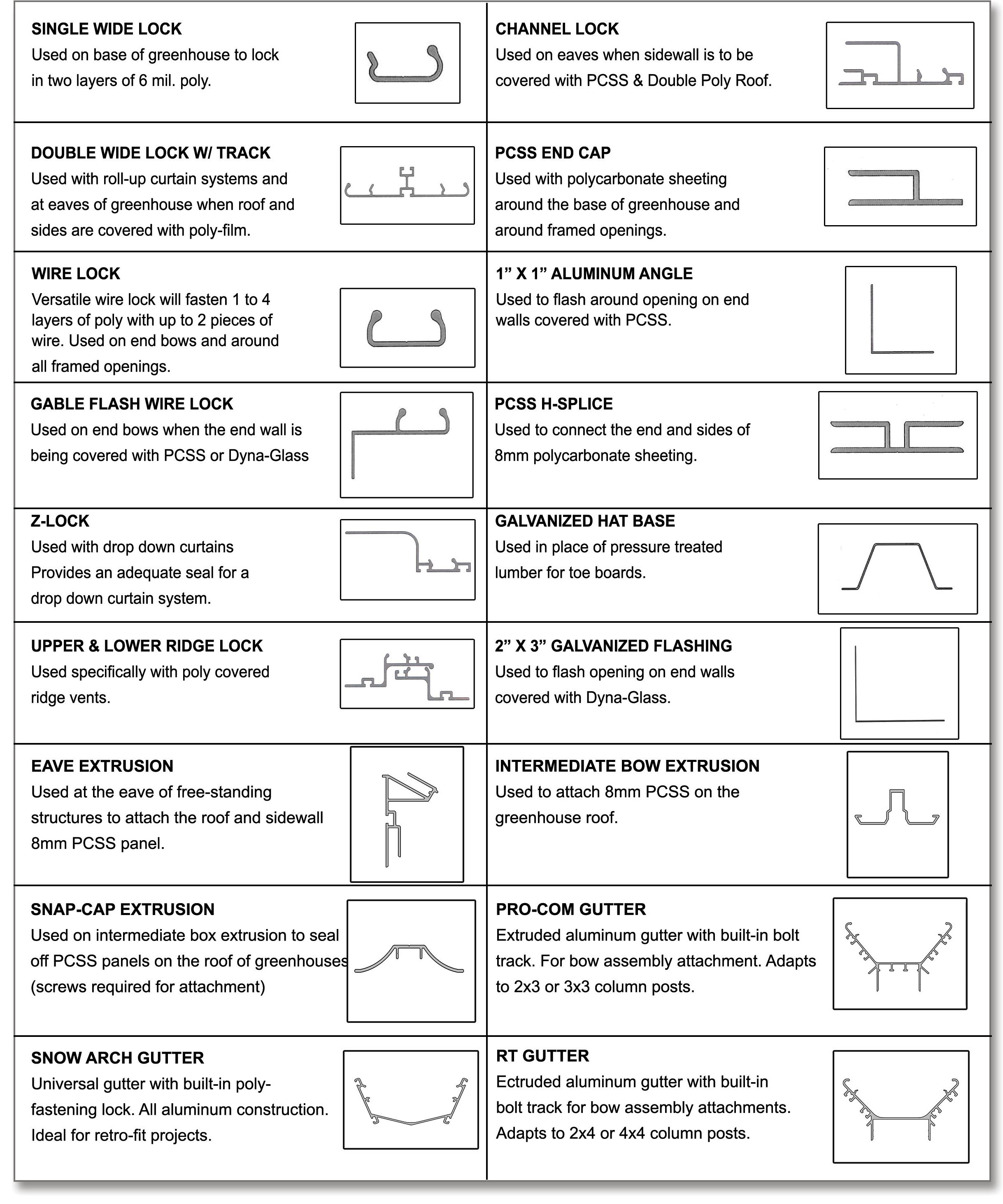 It is the Purchaser’s responsibility to ensure that double poly systems are always inflated. In case of electrical failure, use a generator to keep the inflation system running. When extreme weather conditions are predicted, it is recommended remove poly covering from the structures to prevent structural damage. Ensure all bolts, nuts, anchors, etc. are tightened securely when construction is complete. Extrusions which require ‘snap caps’ are designed for two layers of 6 mil poly to adequately hold in place: single wide lock, double wide lock, channel lock, Z-lock, Snow Arch gutter, RT Max gutter, Pro Com gutter, wall/hinge extrusion. If using these extrusions with seasonal 4 mil poly,