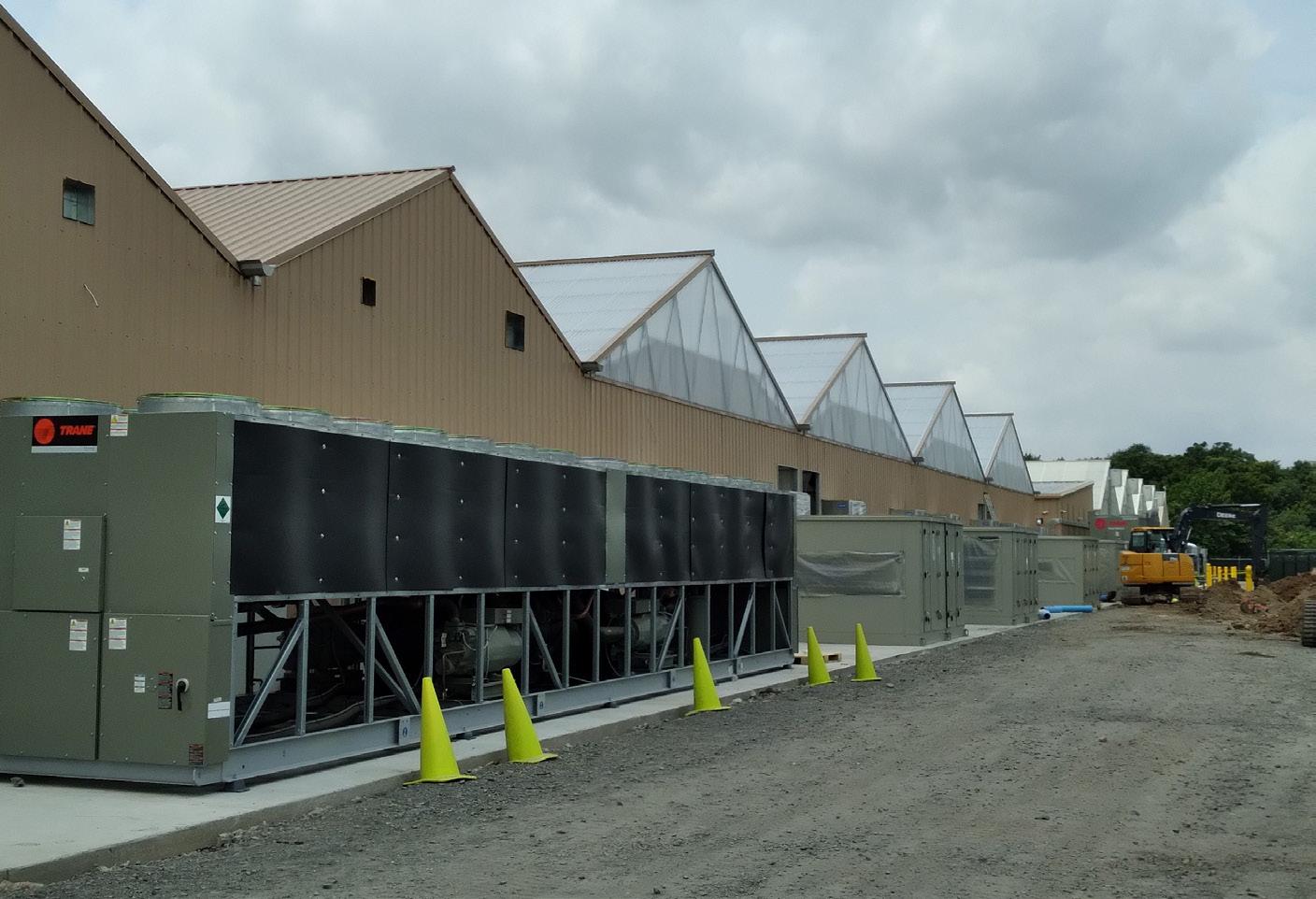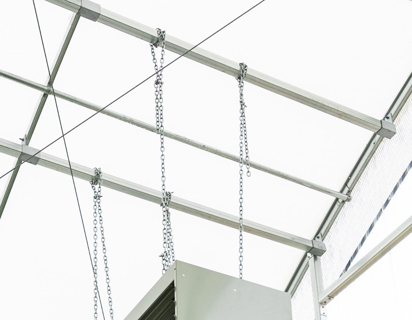 Our Hybrid Greenhouses can utilize dehumidifiers, chillers, coolers, or traditional HVAC systems, allowing the grower to use the greenhouse as a traditional greenhouse most months of the year, utilizing outside air. Then, during those months when the air is too hot, or more likely, too humid, the outside vents close and instead of pulling outside air into the greenhouse, chillers or air conditioners scrub the air free of humidity, mold, pollen, spores, and of course, lower the temperature. Subsequently, this cold air is then pumped into the cooling chamber, where it is pulled into the greenhouse and distributed through the ducts under the crop’s root structure and is forced through the canopy. During this process, the greenhouse remains closed, and the air is returned back to the cooling chamber to be scrubbed of humidity and heat, and then, pumped back into the greenhouse. While this offers incredible control and the most ideal environment, the utility expense during this period can be 10 times as much, or more expensive than the traditional positive pressure methodology of cooling a greenhouse through evaporation of outside ambient air temperature.