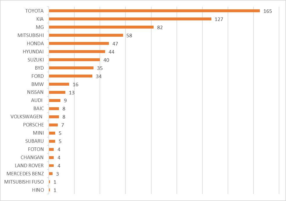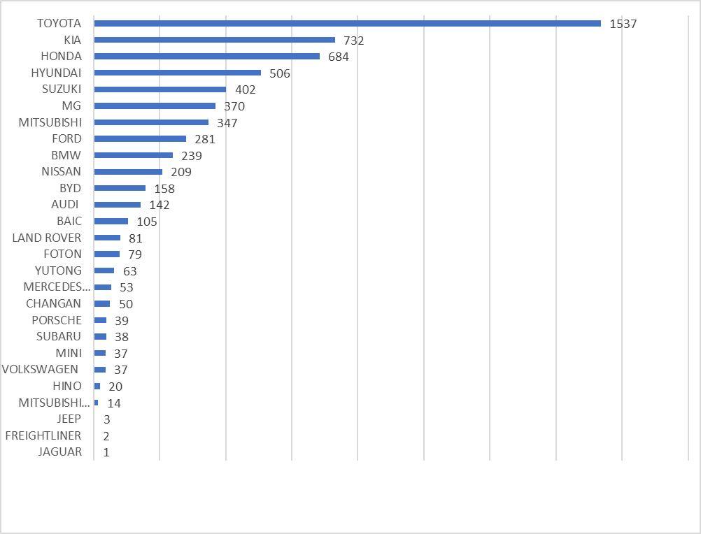 • Toyota remains the leading auto brand with 31% market share.