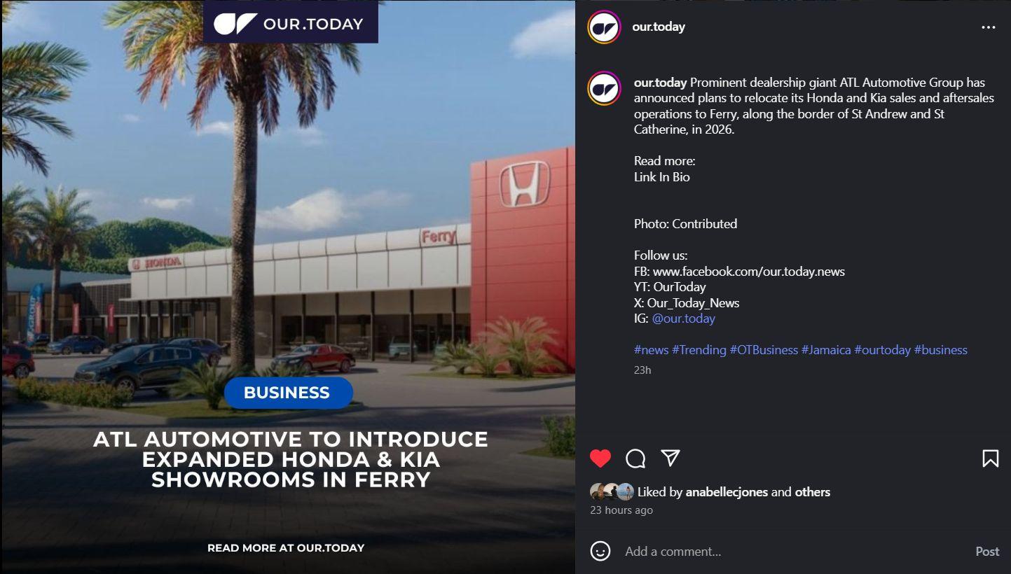 This press release (published in the JamaicaObserverand on OURToday) announces ATL Automotive’s announcement of purpose-built Honda and Kia showrooms and service facilities in Ferry, St. Catherine. The development will relocate operations from Kingston, expand service capacity, and enhance customer experience with modernized sales and aftersales facilities.