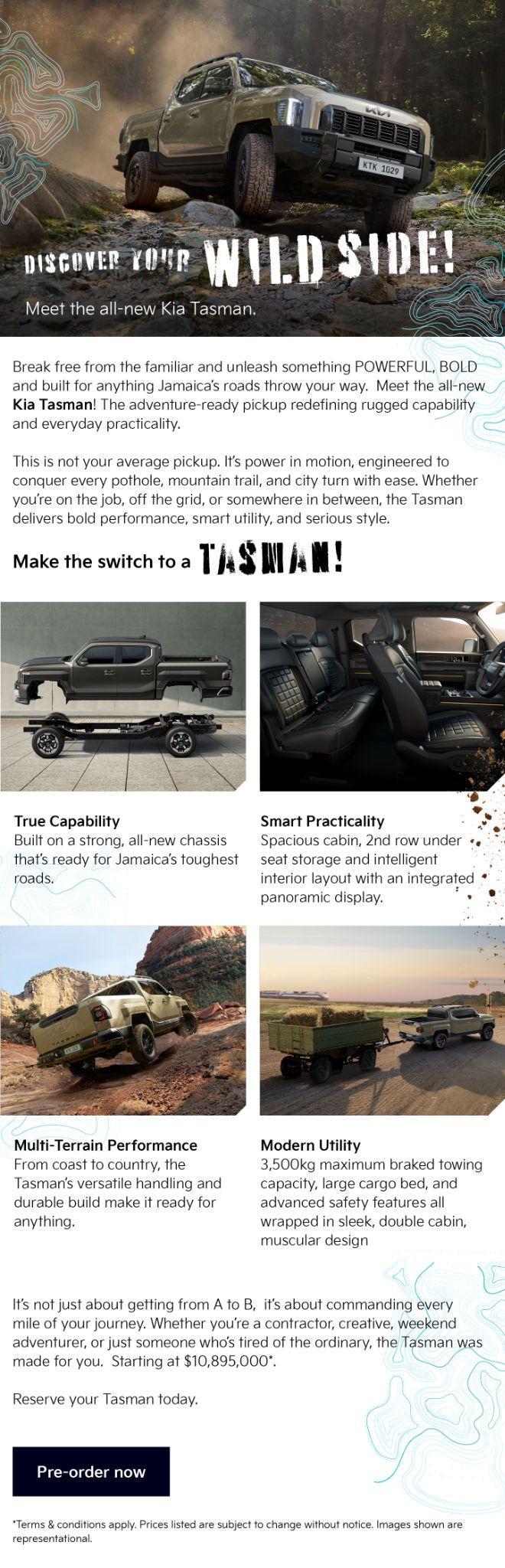 Kia Jamaica is anticipating the launch of the first ever pick-up in it's line-up - The Kia Tasman. To boost both sales (pre-order) and awareness of the model. To help build the model's interest, a pre-order campaign was launched that focused on model info such as capability, features and teasers