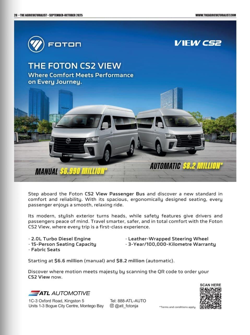 In September, the Foton CS2 View was featured in The Agriculturist newspaper, a well-regarded publication that reaches over 30,000 readers per issue, including farmers, agro-processors, and key decision-makers in the business and agricultural sectors across Jamaica.This placement not only increased brand visibility within a highly targeted market but also positioned the CS2 View as a practical and reliable transportation solution tailored to the needs of the transport community