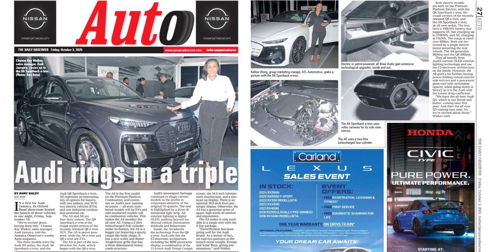 • Press release published on OUR Today(September 28, 2025) announcing ATL Automotive’s launch of the Audi A6 Sportback e-tron in Jamaica.
