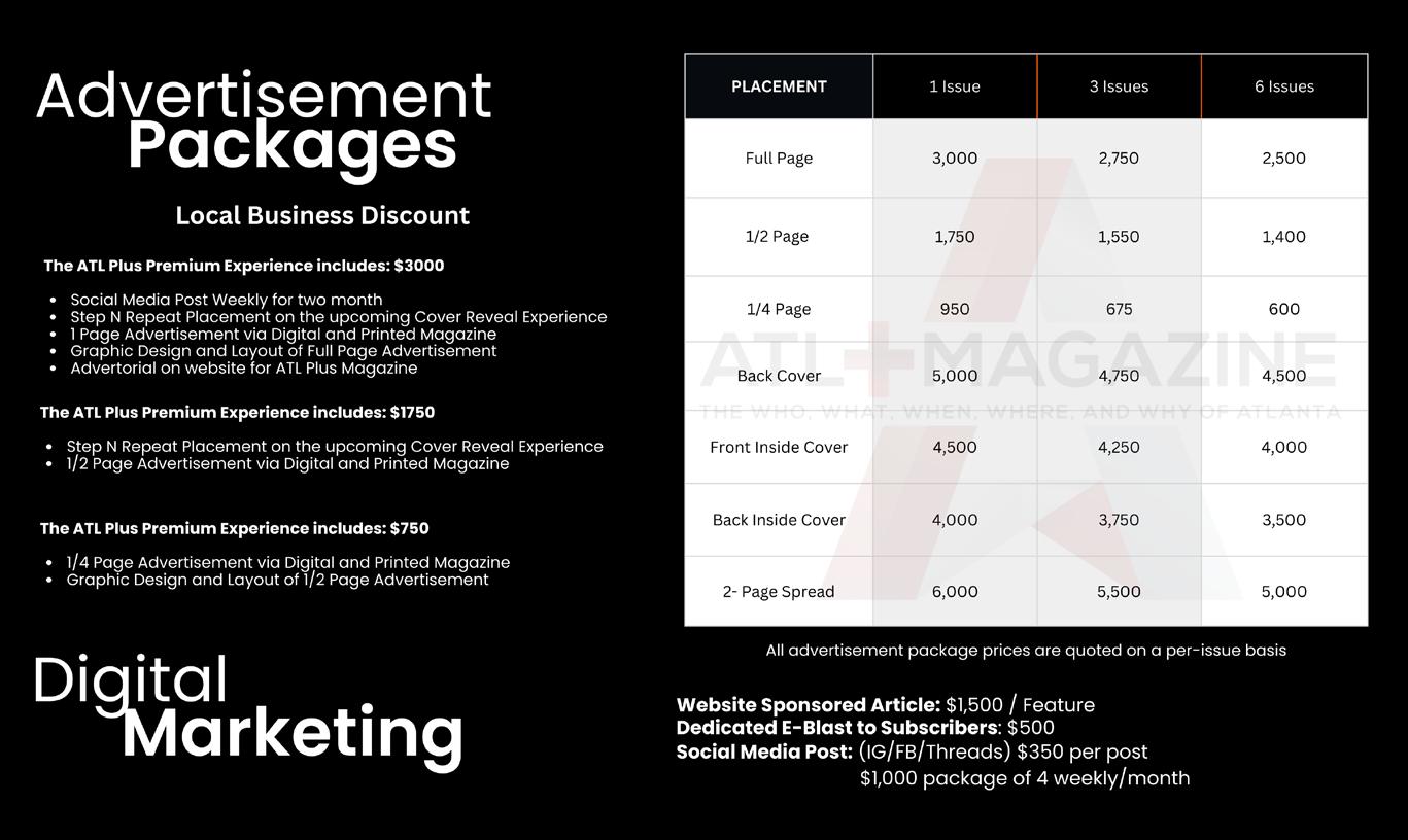 Please contact our marketing team for specifications, rates, and promotions at (404) 3005223 or info@atlplusmag.com. Our creative staff is ready to write your copy/advertisement, provide an eye-popping layout design and even suggest or create award winning photography for your business’s advertisement.