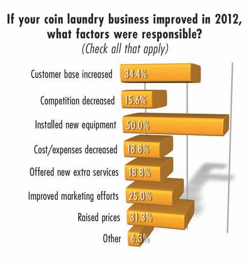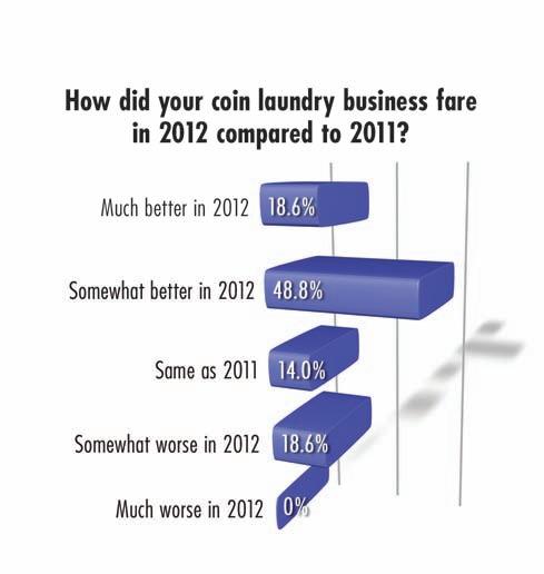 More than two-thirds of self-service laundry owners and operators polled in the last American Coin-Op Wire survey of 2012 said their business was better (“much better,” 18.6%; “somewhat better,” 48.8%) in 2012 than it was in 2011.