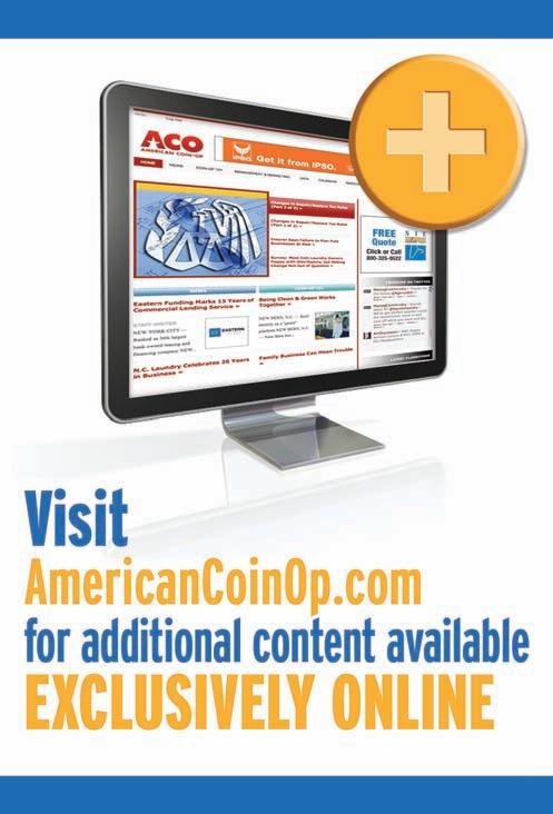 POSTMASTER, Send changes of address and form 3579 to American Coin-Op, Subscription Dept., 440 Quadrangle Drive, Suite E, Bolingbrook, IL 60440. Volume 54, number 1. Editorial, executive and advertising offices are at 566 West Lake Street, Suite 420, Chicago, IL 60661. Charles Thompson, President and Publisher. American Coin-Op is distributed selectively to owners, operators and managers of chain and individually owned coin-operated laundry establishments in the United States. No material appearing in American Coin-Op may be reprinted without written permission. The publisher reserves the right to reject any advertising for any reason.