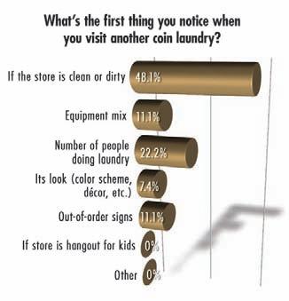 When respondents visit another coin laundry, the first thing that most of them (48.1%) notice is whether the business is clean or dirty. For 22.2%, the first thing they look at is the number of people doing laundry there. Equal shares of 11.1% are looking at equipment mix or if there are out-of-order signs, and the remaining 7.4% have their eye on the store’s look.