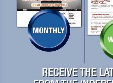 516.752.8008 www.setomaticsystems.com Thanks for visiting us at Clean 2013 • ACCEPT CREDIT, DEBIT AND MOBILE WALLET PAYMENTS • MAINTAIN COIN ACCEPTANCE • VIEW ONLINE REPORTS Setomatic’s SpyderWash and USA Technologies’ ePort Connect Service brings you the best-in-class, cashless payment technology to complement your coin-operated laundry facility. Contact your Setomatic rep to learn how your coin-op laundry can bene t from accepting new payment options. DON’T LIMIT YOUR CUSTOMERS’ PAYMENT OPTIONS