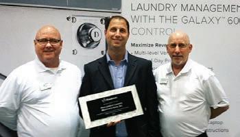 Huebsch National Sales Manager Gary Dixon (left) and Regional Sales Manager Keith York (right) present Marc Katzman, president of Metropolitan Laundry Machinery, with the 2012 Huebsch Distributor of the Year award at the Clean Show.
