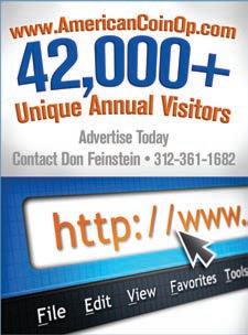 American Coin-Op (ISSN 0092-2811) is published monthly. Subscription prices, payment in advance: U.S., 1 year $39.00; 2 years $73.00. Foreign, 1 year $89.00; 2 years $166.00. Single copies $7.00 for U.S., $14.00 for all other countries. Published by American Trade Magazines LLC, 566 West Lake Street, Suite 420, Chicago, IL 60661. Periodicals postage paid at Chicago, IL and at additional mailing offices.