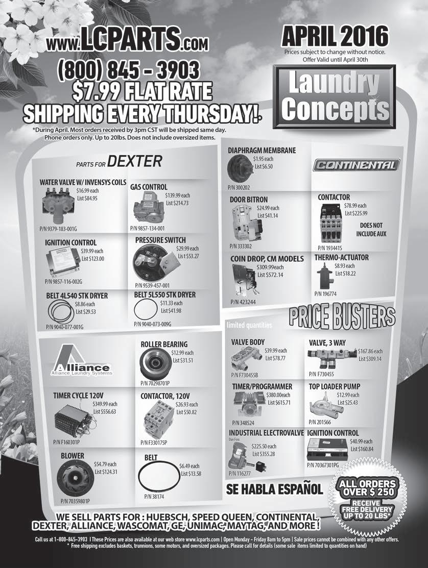 We Now Accept All Major Credit Cards WASHERS and DRYERS COMPUTER BOARD REPAIR Dexter VFD Inverter (Delta Motor Control) All Models (9375-xxx-xxx) $245.00 VFD-A & VFD-B (9732-237-001) call Stack Dryer (9875-xxx-xxx) $65.00 Coin Accumulator $55.00 Wascomat / Electrolux Inverters (MotorControl) All $245.00 471977101,105,115 . . . . . . . . . . . . . . . . . call Compass Control Assembly Gen. 6 $175.00 Selecta II Dryer PCB Assembly .... $175.00 Maytag Computers $65.00 23004118 . . . . . . . . . . . . . . . . . . . . . . . . . call W10343020 call 33001129 . . . . . . . . . . . . . . . . . . . . . . $85.00 ADC 137213, 137234, 137240 $65.00 137253,137274,137275 . . . . . . . . . . . . . . call Igniters (Fenwall only) $30.00 Speed Queen / Huebsch Computers $65.00 Motor Control $95.00 IPSO 209/00440/70 (Micro 20) $115.00 Volume Discounts • One-Year Warranty Free Return Shipping El - Tech, Inc. 26 West St. Colonia, NJ 07067 For Complete Price List Please Call: 732-381-7620 or 908-510-6520 or visit us at www.eltechlab.com SERVICES AND SUPPLIES SERVICES AND SUPPLIES SERVICES AND SUPPLIES Contact classified sales to place your ad! classifieds@americantrademagazines.com Advertiser Page Advertiser Page AC Power 26 American Dryer 13 Automated Laundry Systems..............35 Coin-O-Matic ....................................19 Continental Girbau ..........................IBC Dexter Laundry ....................................3 ESD Inc. ............................... 20, 21, BC Equipment Marketers ........................22 FrontecStore.com ...............................38 Gold Coin Laundry Equipment .........11 Great Lakes Commercial Sales 38 HHC Electronic Service .................... 39 HUB Intl Insurance Services 23 Huebsch ................................. FC, 24, 25 Imonex Services ...................................7 Kings Laundry Group ........................15 Laundry Concepts ............................ 31 Maytag Commercial Laundry 9 Mountain Electronics ........................ 38 New York Laundry Equipment ......... 33 PartsKing.com ....................................29 Progressive Insurance .........................16 R&B Wire Products ............................1 Royal Basket Trucks ..........................37 Setomatic Systems ............................ IFC Super Laundry ...................................27 TheLaundryPass.com .........................17 Tjernlund Products ............................38 Vend-Rite .............................................5 ADVERTISERS’ INDEX CARD READERS FIXED HHC ELECTRONIC SERVICE 1338 Electra Ave., Rowland Hts., CA 91748 626-961-8678 • 800-820-9888 E-mail: hhc168@hotmail.com