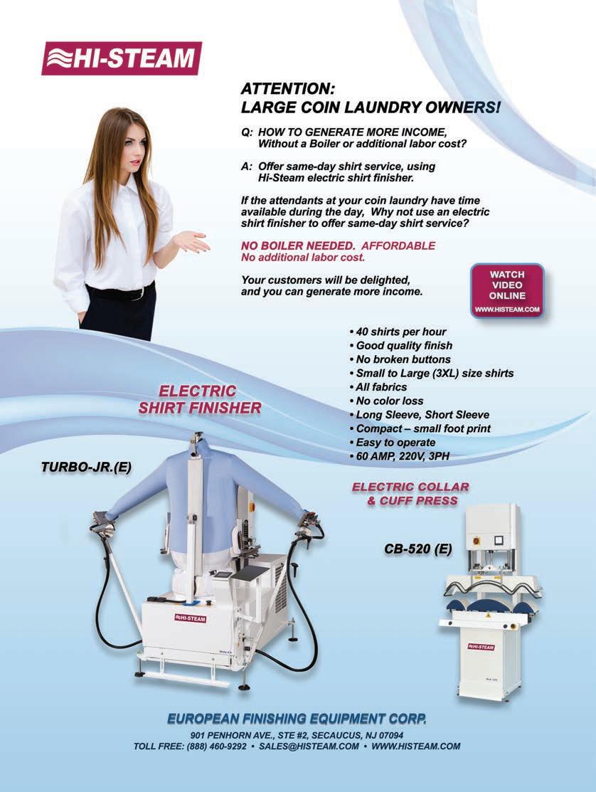 Turbo Jr.(E) (pictured below on left) is the electrically operated shirt finisher. The company says it is perfect for the coin laundry, with the attendant available to add the shirt service for additional income. Again, no boiler is needed, and the machine has a compact footprint, Hi-Steam says.
