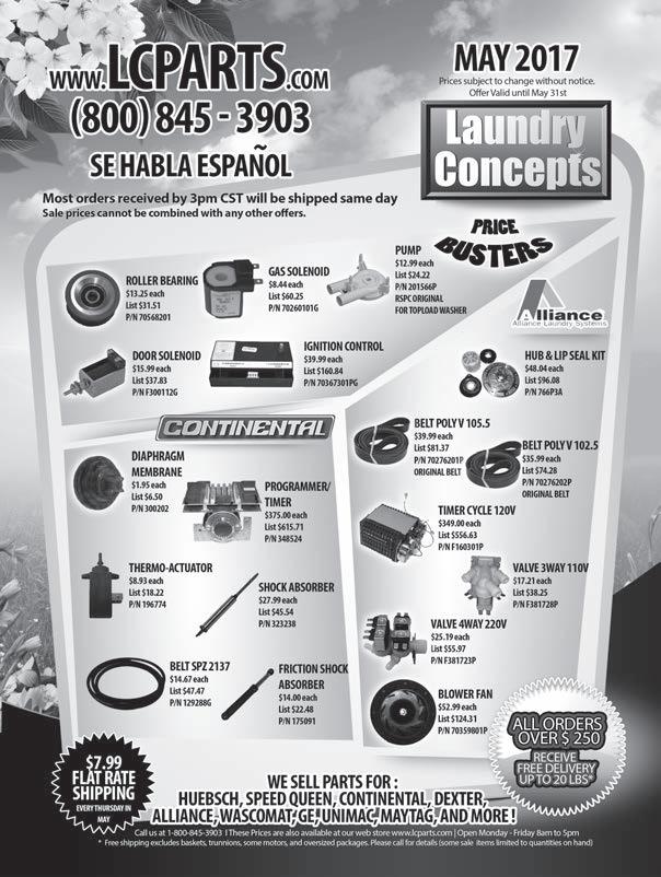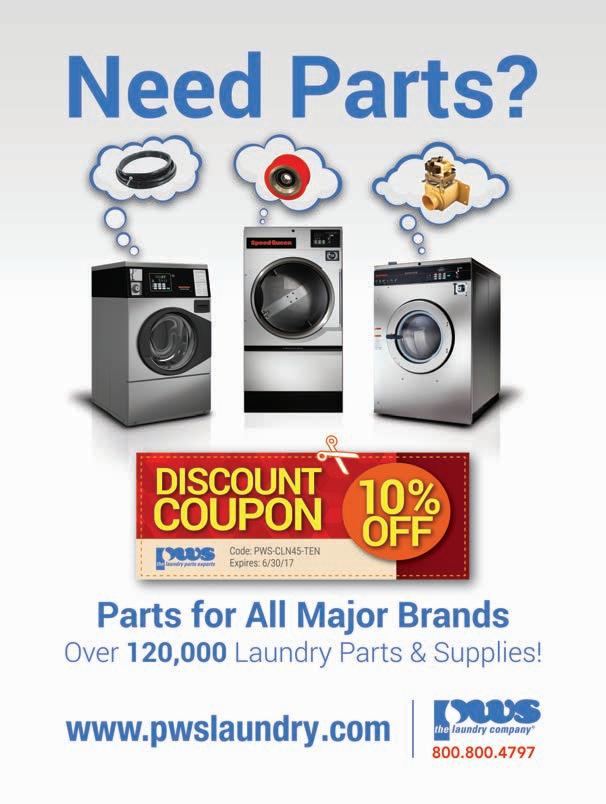 Visit: JECONINC.COM We Now Accept All Major Credit Cards WASHERS and DRYERS COMPUTER BOARD REPAIR Dexter VFD Inverter (Delta Motor Control) All Models (9375-xxx-xxx) $245.00 VFD-A & VFD-B (9732-237-001) call Stack Dryer (9875-xxx-xxx) $65.00 Coin Accumulator $55.00 Wascomat / Electrolux Inverters (MotorControl) All $245.00 471977101,105,115 . . . . . . . . . . . . . . . . . call Compass Control Assembly Gen. 6. $175.00 Selecta II Dryer PCB Assembly $175.00 Maytag Computers $65.00 23004118 . . . . . . . . . . . . . . . . . . . . . . . . . call W10343020 call 33001129 . . . . . . . . . . . . . . . . . . . . . . $85.00 ADC 137213, 137234, 137240 $65.00 137253,137274,137275 . . . . . . . . . . . . . . call Igniters (Fenwall only) $30.00 Speed Queen / Huebsch Computers $65.00 Motor Control $95.00 IPSO 209/00440/70 (Micro 20) $115.00 Volume Discounts • One-Year Warranty Free Return Shipping El - Tech, Inc. 26 West St. Colonia, NJ 07067 For Complete Price List Please Call: 732-381-7620 or 908-510-6520 or visit us at www.eltechlab.com ® 1-800-568-7768 www.cleanersupply.com Wash N’ Fold Bag As Low As $379 Holds up to 50 lbs. SERVICES AND SUPPLIES SERVICES AND SUPPLIES SERVICES AND SUPPLIES www. AmericanCoinOp .com TIMERS REBUILT — IPSO main & reverse, Milnor, Dexter, Primus, Speed Queen, Maytag & Continental Girbau, Wascomat Generation 4, 5 and 6 Reeco Timer Co , 2860 Kirby Circle, N.E., Suite 14, Palm Bay, FL 32905, 888-952-1889. www.reecotimers.com AC Power ........................................ 42 Alco Washer Center ..........................41 BDS Laundry Systems .......................39 Card Concepts ..................................17 Cleaner’s Supply ...............................55 Clean Show .......................................53 Continental Girbau .........................IBC CryptoPay .........................................35 Curbside Laundries ...........................45 D&M Equipment .............................49 Dexter Laundry ................................13 ESD Inc. .............................. 28-29, BC Eastern Funding ................................47 Empire Laundry Machinery ..............50 European Finishing Equipment .........51 FrontecStore.com ..............................54 Gold Coin Laundry Equipment ........19 Great Lakes Commercial Sales 54 HHC Electronic Service 54 Hamilton Engineering .......................46 Huebsch ......................................22-23 Imonex Services ................................11 Laundroworks ..................................37 Laundry Concepts ............................43 Laundry Owners Warehouse 31, 55 Maytag Commercial Laundry ............3 Metro Laundry Tech Corp. ..............55 Monarch Coin & Security ................25 Mountain Electronics ..................48, 54 NIE Insurance ...................................27 Primus Laundry Equipment ..............33 Progressive Insurance ........................15 PWS ..................................................21 R&B Wire Products ...........................1 Royal Basket Trucks .........................48 Setomatic Systems IFC Speed Queen 7, 9 Tjernlund Products ...........................54 Vend-Rite............................................5 Advertiser Page Advertiser Page ADVERTISERS’ INDEX People You Trust! LOWlaundry.com (954) 537-1643