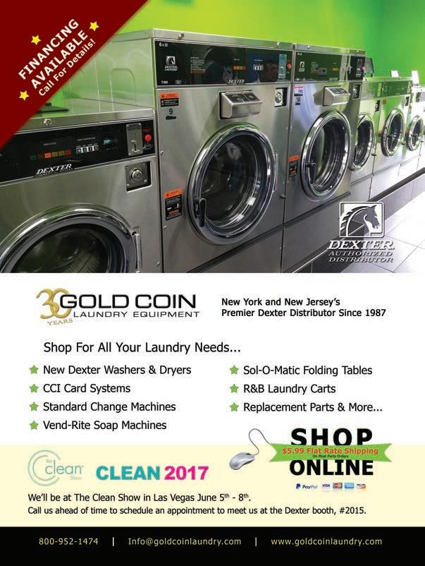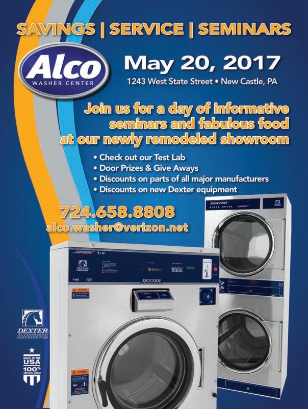 Distributor Open Houses Continue Throughout May Empire Laundry Machinery here uality Meets alue 1(800)359-6262 www.empirelaundryny.com Serving the vended industry in upstate, western, and southern tier New York Markets with these premier brands. ACO Standard_half_horz.indd 1 3/14/17 9:43 AM