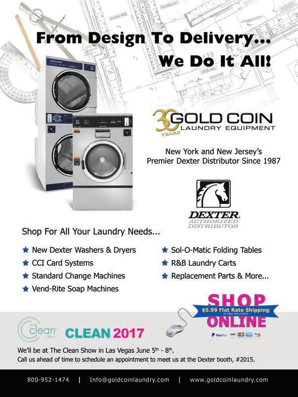 We Now Accept All Major Credit Cards WASHERS and DRYERS COMPUTER BOARD REPAIR Dexter VFD Inverter (Delta Motor Control) All Models (9375-xxx-xxx) $245.00 VFD-A & VFD-B (9732-237-001) . . . . . . . . call Stack Dryer (9875-xxx-xxx) . . . . . . . . . $65.00 Coin Accumulator . . . . . . . . . . . . . . . . $55.00 Wascomat / Electrolux Inverters (MotorControl) All $245.00 471977101,105,115 . . . . . . . . . . . . . . . . . call Compass Control Assembly Gen. 6. $175.00 Selecta II Dryer PCB Assembly $175.00 Maytag Computers . . . . . . . . . . . . . . . . . . . . . $65.00 23004118 . . . . . . . . . . . . . . . . . . . . . . . . . call W10343020 . . . . . . . . . . . . . . . . . . . . . . . call 33001129 . . . . . . . . . . . . . . . . . . . . . . $85.00 ADC 137213, 137234, 137240 . . . . . . . . . . $65.00 137253,137274,137275 . . . . . . . . . . . . . . call Igniters (Fenwall only). . . . . . . . . . . . . . $30.00 Speed Queen / Huebsch Computers . . . . . . . . . . . . . . . . . . . . . $65.00 Motor Control . . . . . . . . . . . . . . . . . . . $95.00 IPSO 209/00440/70 (Micro 20). . . . . . . . . . $115.00 Volume Discounts • One-Year Warranty Free Return Shipping El - Tech, Inc. 26 West St. Colonia, NJ 07067 For Complete Price List Please Call: 908-510-6520 or visit us at www.eltechlab.com ® 1-800-568-7768 www.cleanersupply.com Wash N’ Fold Bag As Low As $379 Holds up to 50 lbs. SERVICES AND SUPPLIES SERVICES AND SUPPLIES SERVICES AND SUPPLIES TIMERS REBUILT — IPSO main & reverse, Milnor, Dexter, Primus, Speed Queen, Maytag & Continental Girbau, Wascomat Generation 4, 5 and 6. Reeco Timer Co., 2860 Kirby Circle, N.E., Suite 14, Palm Bay, FL 32905, 888-952-1889. www.reecotimers.com AC Power ........................................ 43 American Switch 46 BDS Laundry Systems ....................... 19 Cleaner’s Supply 47 Coin-O-Matic ................................... 27 Continental Girbau IBC CryptoPay ......................................... 17 Dexter Laundry 3 ESD Inc. .............................. 24-25, BC FrontecStore.com 46 Gold Coin Laundry Equipment ........ 23 Great Lakes Commercial Sales 46 Gulf States Laundry Machinery ........ 31 HHC Electronic Service 46 Huebsch ...................................... 28-29 Imonex Services ................................ 11 Laundry Concepts 39 Laundry Owners Warehouse ............ 15 Metro Laundry Tech Corp. .............. 47 Metropolitan Laundry Machinery ........ 33 Mountain Electronics ..................44, 46 NIE Insurance ................................... 13 Parts Distributors 41 Primus Laundry Equipment 37 Progressive Insurance 18 R&B Wire Products 1 Royal Basket Trucks 44 SES Laundry 21 Setomatic Systems IFC Speed Queen 7, 9 Tjernlund Products 46 TLC Tri-State Laundry Companies ... 35 Vend-Rite............................................ 5 Advertiser Page Advertiser Page ADVERTISERS’ INDEX 2017 RATES: One- to five-time rate: $2.65 per word, boldface $2.75 per word. Minimum charge: $25.00 per ad. Call or write for our three- and 12-time rates. If box number is used, add cost of 5 words. Display classified rates are available on request. All major credit cards are accepted. DEADLINE: Ads must be received by the 1st of the preceding month. For example, for a June ad, the closing date is May 1st. PAYMENT FOR CLASSIFIED ADS: Must accompany order.