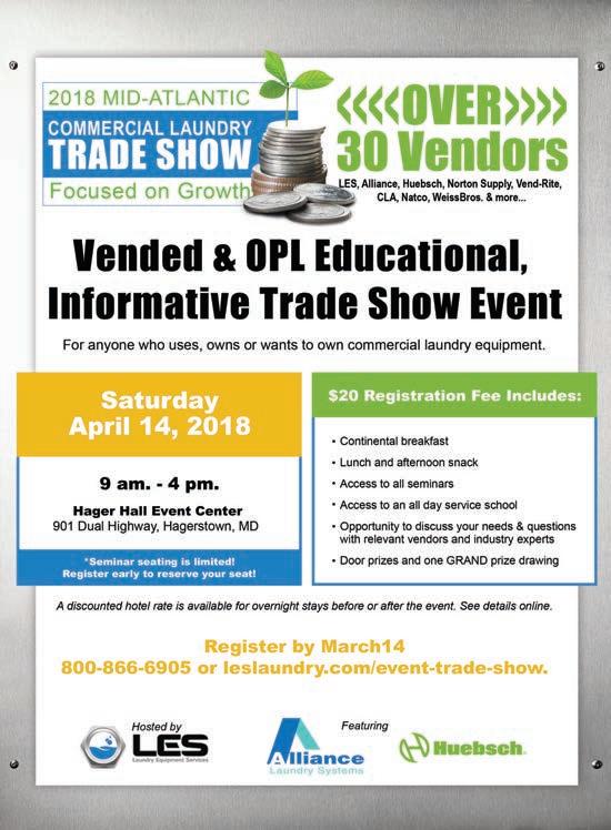 © Copyright AMERICAN TRADE MAGAZINES LLC, 2018. Printed in U.S.A. No part of this publication may be transmitted or reproduced in any form, electronic or mechanical, without written permission from the publisher or his representative. American Coin-Op does not endorse, recommend or guarantee any article, product, service or information found within. Opinions expressed are those of the writers and do not necessarily reflect the views of American Coin-Op or its staff. While precautions have been taken to ensure the accuracy of the magazine’s contents at time of publication, neither the editors, publishers nor its agents can accept responsibility for damages or injury which may arise therefrom.
