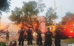 After battling the fire at Garland Supply, Hialeah, Fla., fire personnel watch through smoke and haze as their relief crews work to contain the Nov. 9 blaze that consumed the entire warehouse. This was the second of two fires within 36 hours to happen at the same location. (Photo: Jeff Zaitz, Garland Supply Co.)