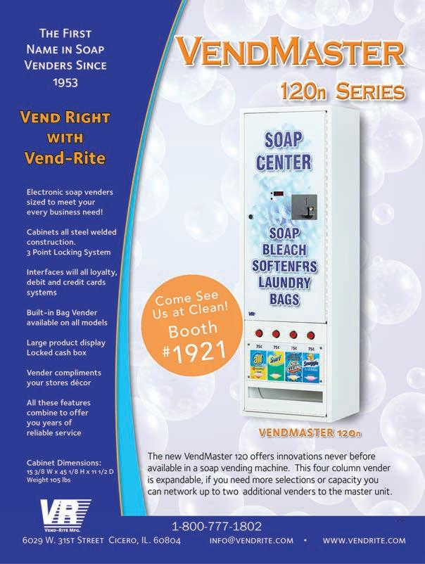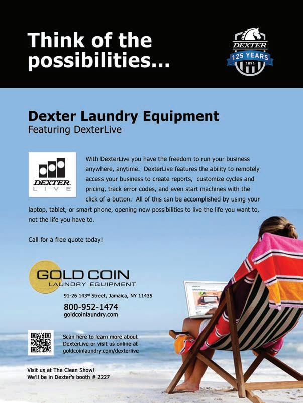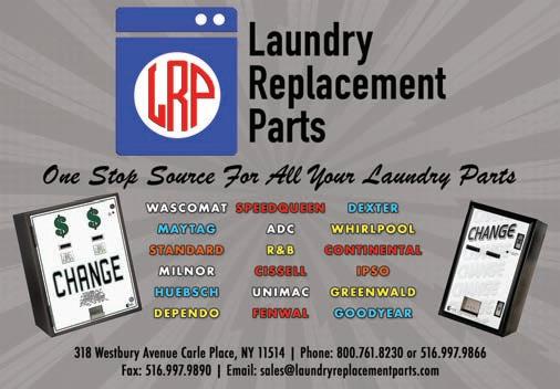 We Now Accept All Major Credit Cards WASHERS and DRYERS COMPUTER BOARD REPAIR Dexter VFD Inverter (Delta Motor Control) All Models (9375-xxx-xxx) $245.00 VFD-A & VFD-B (9732-237-001) . . . . . . . . call Stack Dryer (9875-xxx-xxx) . . . . . . . . . $65.00 Coin Accumulator . . . . . . . . . . . . . . . . $65.00 Igniters (Fenwal only) . . . . . . . . . . . . . . $40.00 Wascomat / Electrolux Inverters (MotorControl) All $245.00 471977101,105,115 . . . . . . . . . . . . . . . . . call Emerald Selecta Gen. 6 Washer Main Computer PCB $175.00 Emerald Selecta Washer Door Lock Control PCB $75.00 Compass Control Assembly Gen. 6. $125.00 Selecta II Dryer PCB Assembly . . . . $155.00 Maytag Computers . . . . . . . . . . . . . . . . . . . . . $65.00 23004118 . . . . . . . . . . . . . . . . . . . . . . . . . call W10343020 . . . . . . . . . . . . . . . . . . . . . . . call ADC 137213, 137234, 137240 . . . . . . . . . . $65.00 137253,137260,137274,137275. . . . . . . . call Igniters (Fenwal only) . . . . . . . . . . . . . . $40.00 Speed Queen / Huebsch Computers . . . . . . . . . . . . . . . . . . . . . $65.00 Motor Control . . . . . . . . . . . . . . . . . . . . . . call IPSO 209/00440/70 (Micro 20). . . . . . . . . . $125.00 Volume Discounts • One-Year Warranty Free Return Shipping El - Tech, Inc. 26 West St. Colonia, NJ 07067 For Complete Price List Please Call: 908-510-6520 or visit us at www.eltechlab.com SERVICES AND SUPPLIES SERVICES AND SUPPLIES SERVICES AND SUPPLIES CARD READERS FIXED HHC ELECTRONIC SERVICE 1338 Electra Ave., Rowland Hts., CA 91748 626-961-8678 • 844-846-0371 E-mail: hhc168@hotmail.com www. AmericanCoinOp .com TIMERS REBUILT — IPSO main & reverse, Dexter, Primus, Speed Queen, Maytag & Continental Girbau, Wascomat Generation 4, 5 and 6. Reeco Timer Co., 2860 Kirby Circle, N.E., Suite 14, Palm Bay, FL 32905, 888-952-1889. www.reecotimers.com AC Power .............................................. 33 ACE Commercial Laundry Equipment 36 American Switch 39 BDS Laundry Systems 15 CSC Serviceworks ....................................31 Cleaner’s Supply 39 Continental Girbau 1 CryptoPay 7 Dexter Laundry Inc........................... 23, 25 ESD Inc. 20-21, BC FrontecStore.com 38 Gold Coin Laundry Equipment ...............19 Great Lakes Commercial Sales ................38 HHC Electronic Service 39 High Mark Manufacturing 35 Huebsch .....................................................9 Imonex Services .......................................38 Kargi Fabric 38 Laundry Concepts 27 LG Electronics .......................................IBC Low Cost Manufacturing.........................37 Maytag Commercial Laundry 13 Metro Laundry Tech Corp. 39 Mountain Electronics...............................38 NIE Insurance 17 PartsKing 29 Setomatic Systems IFC Speed Queen .............................. cover tip, 3 Starchup...................................................30 TheLaundryPass.com 11 TOLON 28 Tjernlund Products ..................................38 Vending Machine Sales 38 Vend-Rite...................................................5 Advertiser Page ADVERTISERS’ INDEX
