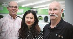Oasis Laundry owner Xiaoyan Shao (center) poses in her Sanford, Florida, business with (left) David Chadsey, vice president of Statewide Laundry Equipment, and (right) Rusty Parks, Statewide consultant. (Photo: Statewide Laundry Equipment)