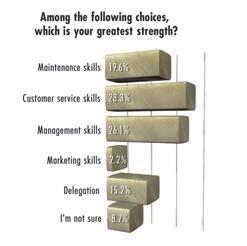 Thinking about the skills you utilize in running your own store, which do you think is your greatest strength? There was no clear No. 1 among respondents. Roughly 28% picked customer service, 26.1% said management, 19.6% pointed to maintenance, 15.2% said it is the ability to delegate and 2.2% chose marketing. The remaining 8.7% were unsure about their greatest strength.