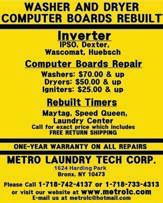 www.americancoinop.com JANUARY 2020 AMERICAN COIN-OP 31 WASHERS and DRYERS COMPUTER BOARD REPAIR Dexter VFD Inverter (Delta Motor Control) All Models (9375-xxx-xxx) $245.00 VFD-A & VFD-B (9732-237-001) . . . . . . . . call Stack Dryer (9875-xxx-xxx) . . . . . . . . . $65.00 Coin Accumulator . . . . . . . . . . . . . . . . $65.00 Igniters (Fenwal only) . . . . . . . . . . . . . . $40.00 Wascomat / Electrolux Inverters (MotorControl) All $245.00 471977101,105,115 . . . . . . . . . . . . . . . . . call Emerald Selecta Gen. 6 Washer Main Computer PCB . . . . . . . . . . . . . . . . . . $175.00 Emerald Selecta Washer Door Lock Control PCB $75.00 Compass Control Assembly Gen. 6. $125.00 Selecta II Dryer PCB Assembly $155.00 Maytag Computers . . . . . . . . . . . . . . . . . . . . . $65.00 23004118 . . . . . . . . . . . . . . . . . . . . . . . . . call W10343020 . . . . . . . . . . . . . . . . . . . . . . . call ADC 137213, 137234, 137240 . . . . . . . . . . $65.00 137253,137260,137274,137275. . . . . . . . call Igniters (Fenwal only) . . . . . . . . . . . . . . $40.00 Speed Queen / Huebsch Computers . . . . . . . . . . . . . . . . . . . . . $65.00 Motor Control . . . . . . . . . . . . . . . . . . . . . . call IPSO 209/00440/70 (Micro 20). . . . . . . . . . $125.00 Volume Discounts • One-Year Warranty Free Return Shipping El - Tech, Inc. 26 West St. Colonia, NJ 07067 For Complete Price List Please Call: 908-510-6520 or visit us at www.eltechlab.com SINGLE-COPY SALES To order any current or back issue of American Coin-Op by phone, or to subscribe, call our circulation customer service department at: 1-630-739-0600 www.AmericanCoinOp.com POSITIONS AVAILABLE SERVICES AND SUPPLIES SERVICES AND SUPPLIES SERVICES AND SUPPLIES www. AmericanCoinOp .com www. AmericanCoinOp .com TIMERS REBUILT — IPSO main & reverse, Dexter, Primus, Speed Queen, Maytag & Continental Girbau, Wascomat Generation 4, 5 and 6. Reeco Timer Co., 1855 Union Blvd., Ste A Bay Shore, NY 11706 631-498-6999 Laundry Mechanic Wanted (954) 537-1643 AC Power ................................................ 25 ACE Commercial Laundry Equipment 23 American Switch 31 Card Concepts .......................................... 13 Cleaner’s Supply 31 Continental Girbau 1 CryptoPay 30 ESD Inc. ...................................... 16-17, BC Gold Coin Laundry Equipment 15 HHC Electronic Service 31 High Mark Manufacturing ....................... 11 Huebsch 9 Imonex Services 30 LG Electronics ........................................ IBC Laundry Concepts .................................... 19 Low Cost Manufacturing ......................... 21 Maytag Commercial Laundry 7 Metro Laundry Tech Corp. 31 Mountain Electronics 27 Setomatic Systems IFC Speed Queen 3 Tjernlund Products 30 Vending Machine Sales 30 Vend-Rite 5 WASH Commercial Laundry 30 Advertiser Page Advertiser Page ADVERTISERS’ INDEX COMPUTER BOARDS FIXED HHC ELECTRONIC SERVICE 1338 Electra Ave., Rowland Hts., CA 91748 626-961-8678 • 844-846-0371 E-mail: hhc168@hotmail.com Repaired & Rebuilt to Manufacture Specs. Shipped Anywhere. • American • Dexter • • Easy Card, ESD • • Huebsch • Speed Queen •