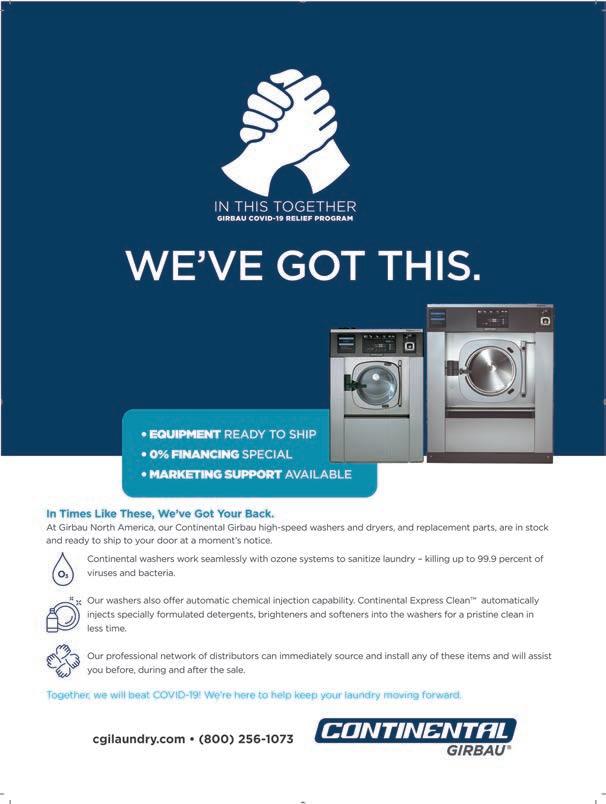 American Coin-Op can now be viewed on tablets and other mobile devices – great ways to stay on top of the latest industry news and updates. www.americancoinop.com The independent voice of the self-service laundry industry It’s not just print anymore. www.americancoinop.com MAY 2020 AMERICAN COIN-OP 11 that provide a basic health service by serving millions of families with a safe place to wash and dry their clothes every week. “Access to services is particularly important for Laundromat customers who are often low-income families with few alternatives to the neighborhood Laundromat for clothes washing,” the CLA statement read. Initially, when governors began issuing business closure orders, laundries weren’t always listed as being exempt. Often, the state officials relied on an “Essential Critical Workforce Infrastructure” advisory list prepared by CISA, a division of the U.S. Department of Homeland Security. It was intended to help state and local governments ensure continuity of functions critical to public health and safety, as well as economic and national security—and laundry services didn’t make the cut. But an ad hoc alliance that CLA President/CEO Brian Wallace described during an association webinar as “our industry manufacturers, a couple of store owners and CLA” advocated at the federal level and successfully petitioned to have laundries added to the types of businesses officially deemed “essential.” American Coin-Op polled store owners about the pandemic in early April and many respondents reported they take great pride in their laundries being recognized in this way but also expressed concern about the added customer service and safety issues the pandemic raises and how to safely conduct business. A few owners said they had decided to close for the time being. OPEN AND ADAPTIVE Adapting to government guidances on cleaning and social distancing has meant additional challenges for laundry owners. Some of the special measures they’ve taken, based on the early April survey, have been cleaning/sanitizing laundry equipment and store fixtures more often; posting signage about personal hygiene and safe laundering guidelines; limiting the number of people in the store at any one time; promoting social distancing by blocking off areas/machines; increasing advertising or social media efforts; and emphasizing wash/dry/fold or pickup/delivery service. Less than 5% of responding store owners said they were taking no special meaNeal Shapiro co-owns WashTime on Fullerton, fully attended 6,000-squarefoot store in Chicago, with his wife Kate. When restrictions designed to prevent gatherings took hold in his state, he knew his laundry “can’t just be business as usual,” he relates during a CLA webinar. “So we began to figure out what we could do to minimize the density in our Laundromat and try to work around the ideas of social distancing at 6 feet, only so many people in the store at a time.” Some stores are asking customers to wait in their cars or at home while their loads are being washed or dried. WashTime on Fullerton is among those that decided self-service customers could no longer fold there, thus shortening the time they remain inside. Shapiro’s store, previously open 24/7, also cut back its operating hours. “It’s not great for our bottom line but it’s what we had to do to make sure that everybody that came in was safe,” he says. Early on, Steve Lamiell, owner of the North Canton and Lake Cable Laundromats in Ohio, had his staff sanitizing high-touch areas and had posted flyers asking customers to wash their hands, cover coughs/sneezes and to not enter the premises if they felt ill. He also offered touch-free hand sanitizers. “We realize that our efforts aren’t going to stop the (COVID-19) spread; however, we believe it will help prevent the spread and show our customers as well as our team that we care,” he said in the days immediately after social distancing guidelines took hold. WORK TOGETHER WHILE WE WAIT Understanding the added stresses that the medical emergency and isolation safeguards have created, some businesses offered to do laundry free or at little cost for senior citizens, doctors and first responders. There were drives to collect masks, gloves and other supplies for first responders and healthcare workers. There are no doubt many other examples throughout the industry of businesses and organizations doing what they can to serve their communities, whether it involves laundry services or not. Manufacturers, distributors and other businesses linked to the laundry industry have shared information about the best ways to deal with a pandemic. Many have added or adjusted resources to better serve laundry owners, mindful that their own operations and staffs are subject to the same pandemic risks. American Coin-Op created a flyer (below) that store owners can print and post to encourage customers to launder often and the proper way. The healthcare community worldwide is working on a vaccine to control the coronavirus and bring this pandemic to an end but how long that will take to accomplish remains to be seen. In early April, American Coin-Op asked store owners how long they thought COVID-19 would directly impact their business. Thirteen percent believed it would be less than 90 days, 50% said it would be longer than 90 days, and the remaining 37% said they didn’t know. “Pray that it ends soon with minimal loss of life,” a survey respondent wrote of the pandemic. “We can rebuild our businesses and the economy. We cannot bring back our friends and family that have succumbed to this virus.” COVID-19 Resources Specific to Laundry Services American Coin-Op — https://tinyurl.com/americancoinop Coin Laundry Association — https://tinyurl.com/CoinLaundryAssn Dexter Laundry — https://www.dexter.com/coronavirus Huebsch — https://huebsch.com/covid-19 PWS The Laundry Company — https://tinyurl.com/PWSCovid-19 Speed Q