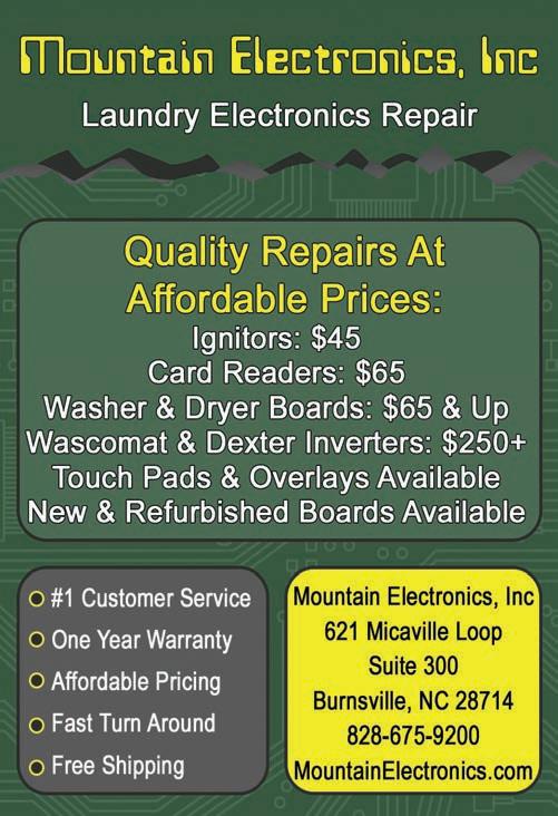 www.americancoinop.com MARCH 2021 AMERICAN COIN-OP 31 WASHERS and DRYERS COMPUTER BOARD REPAIR Dexter VFD Inverter (Delta Motor Control) All Models (9375-xxx-xxx) $245.00 VFD-A & VFD-B (9732-237-001) call Stack Dryer (9875-xxx-xxx) $65.00 Coin Accumulator $65.00 Igniters (Fenwal only) $40.00 Wascomat / Electrolux Inverters (MotorControl) All ...... $245.00 471977101,105,115 . . . . . . . . . . . . . . . . . call Emerald Selecta Gen. 6 Washer Main Computer PCB $175.00 Emerald Selecta Washer Door Lock Control PCB ...................... $75.00 Compass Control Assembly Gen. 6 $125.00 Selecta II Dryer PCB Assembly $155.00 Maytag Computers $65.00 23004118 . . . . . . . . . . . . . . . . . . . . . . . . . call W10343020 call ADC 137213, 137234, 137240 $65.00 137253,137260,137274,137275 call Igniters (Fenwal only) $40.00 Speed Queen / Huebsch Computers $65.00 Motor Control call IPSO 209/00440/70 (Micro 20) $125.00 Volume Discounts • One-Year Warranty Free Return Shipping El - Tech, Inc. 26 West St. Colonia, NJ 07067 For Complete Price List Please Call: 908-510-6520 or visit us at www.eltechlab.com EVERYDAY LOW PRICES 800-568-7768 CLEANERSUPPLY.COM VENDING MACHINE PRODUCTS WASH N’ FOLD BAGS PLASTIC COIN-OP BAGS WIRE CARTS SERVICES AND SUPPLIES 2021 RATES: One- to five-time rate: $2 80 per word, boldface $2.85 per word. Minimum charge: $25.00 per ad Call or write for our six- and 12-time rates If box number is used, add cost of 5 words. Display classified rates are available on request All major credit cards are accepted. DEADLINE: Ads must be received by the 1st of the preceding month For example, for a June ad, the closing date is May 1st. PAYMENT FOR CLASSIFIED ADS: Must accompany order AC Power .................................................20 Advanced ATM Systems Inc. ....................17 BDS Laundry Systems...............................11 Card Concepts ............................................3 Cleaner’s Supply .......................................31 Continental Girbau ....................................1 CryptoPay ................................................30 Eastern Funding .......................................25 ESD Inc. ..................................................BC Gold Coin Laundry Equipment ................13 Hainsworth Laundry Co. .........................31 Imonex Services ........................................30 Laundry Concepts ....................................15 LaundryParts.com ....................................23 LG Electronics ........................................IBC Metro Laundry Tech Corp. ......................31 Monarch Coin & Security ........................19 Mountain Electronics 21, 30 Setomatic Systems IFC Speed Queen ...............................................7 Statewide Laundry Equipment....................9 Sudsy Vending Supplies ............................23 Tjernlund Products ...................................30 Vending Machine Sales .............................30 Vend-Rite ...................................................5 WASH Commercial Laundry ....................30 Advertiser Page Advertiser Page ADVERTISERS’ INDEX SERVICES AND SUPPLIES SERVICES AND SUPPLIES Contact classified sales to place your ad! classifieds@atmags.com DOES YOUR CAMPUS LAUNDRY PARTNER TREAT YOUR STUDENTS LIKE FAMILY? WE DO. Through attentive care, education, and state-of-the-art equipment, Hainsworth helps your students transition into laundry masters. Call 800-526-0955 today to get started. hainsworthlaundry.com SERVICES AND SUPPLIES Check Out More Listings ONLINE www.AmericanCoinOp.com www. AmericanCoinOp .com