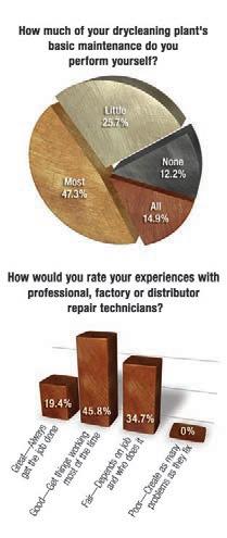 “Routine maintenance and required maintenance logs are crucial to a success ful drycleaning operation,” one respondent says. The majority stressed the importance of self-reliance when it comes to perform ing basic maintenance tasks.