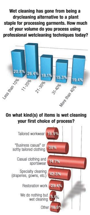While some respondents say they strict ly process garments through wetcleaning techniques, others countered by saying that it should only be used as an alternative. “I do not believe that wet cleaning is the best method for all garments,” one says. “Some fabrics and fibers need to be dry cleaned.”
