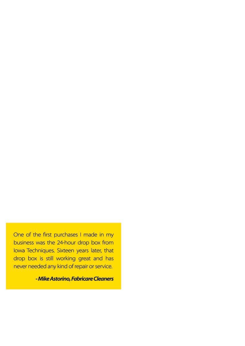 fabricaremanager.com • 888.249.5142 Drycleaning Management at Your Fingertips Fabricare Manager Not satis ed with your point of sale computer hardware and software? Move to Fabricare Manager’s a ordable, reliable and secure system. You (and your customers) will be happy you did. Just tell us you’re ready to make the change. Or, If you’re not yet using a POS, why not start with the best? Time to Switch? Come see us at the SDLS, June 20–22, in Jacksonville • Booth # 215