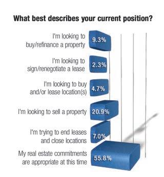 When asked about their current real estate position, the majority—55.8%—say their commitments are appropriate at this time. Roughly 21% are looking to sell a property, and 7% are trying to end leases and close locations.