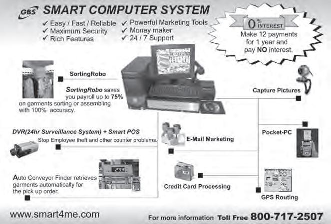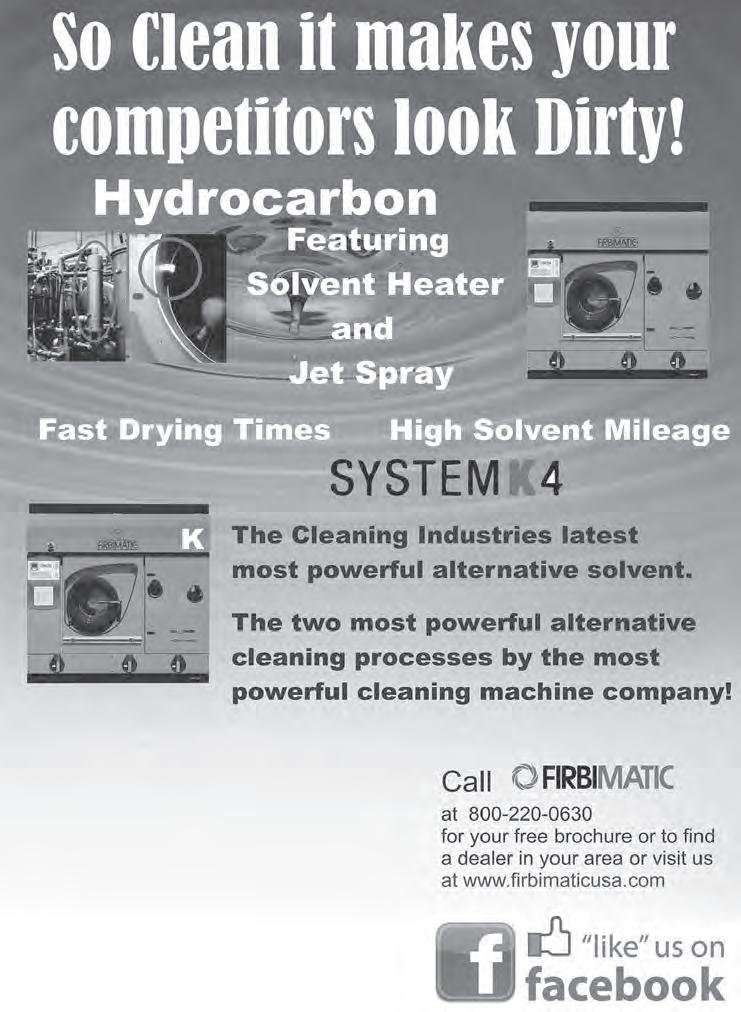 POSTMASTER, Send changes of address and form 3579 to American Drycleaner, Subscription Dept., 440 Quadrangle Drive, Suite E, Bolingbrook, IL 60440. Volume 82, number 6. Editorial, executive and advertising offices are at 566 West Lake Street, Suite 420, Chicago, IL 60661. Charles Thompson, President and Publisher. American Drycleaner is distributed selectively to: qualified dry cleaning plants and distributors in the United States. The publisher reserves the right to reject any advertising for any reason. © Copyright AMERICAN TRADE MAGAZINES LLC, 2015. Printed in U.S.A. No part of this publication may be transmitted or reproduced in any form, electronic or mechanical, without written permission from the publisher or his representative. American Drycleaner does not endorse, recommend or guarantee any article, product, service or information found within. Opinions expressed are those of the writers and do not necessarily reflect the views of American Drycleaner or its staff. While precautions have been taken to ensure the accuracy of the magazine’s contents at time of publication, neither the editors, publishers nor its agents can accept responsibility for damages or injury which may arise therefrom.